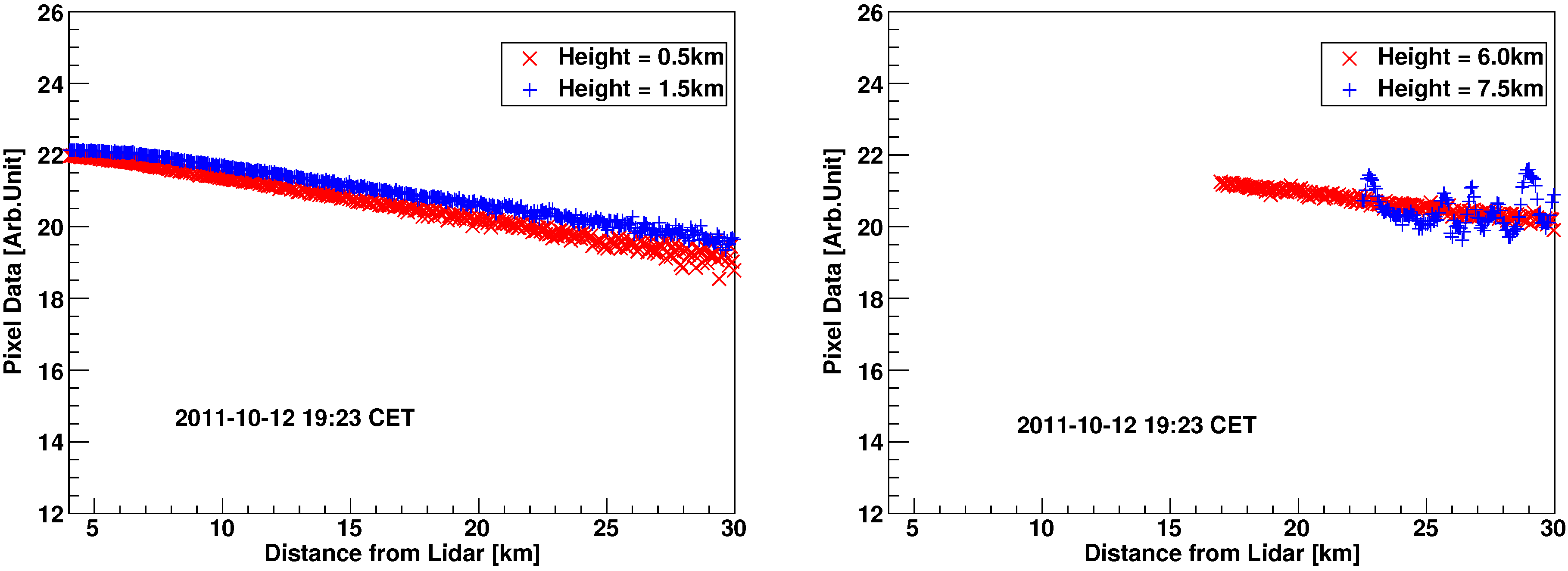 Figure 5 shows the horizontal pixel data extracted from the 2D RHI diagram (Figure 4, bottom) at the heights of 0.5 km, 1.5 km, 6.0 km and 7.5 km. From the plots, we can see that at the heights of 0.5 km, 1.5 km and 6.0 km, the horizontal pixel data with the weighted logarithm RSCS values form almost a straight line, justifying the assumption of horizontal atmospheric homogeneity at these heights in the study region. While the horizontal pixel data at the height of 7.5 km are loosely distributed, which was the result of the cloud turbulence (Figure 4). Therefore, by examining the horizontal pixel data at all heights from the 2D RHI diagram, we can say that the assumption of a horizontal homogeneous atmosphere in the study region (Figure 2) can be made up to the height of 6.0 km during this measurement section.