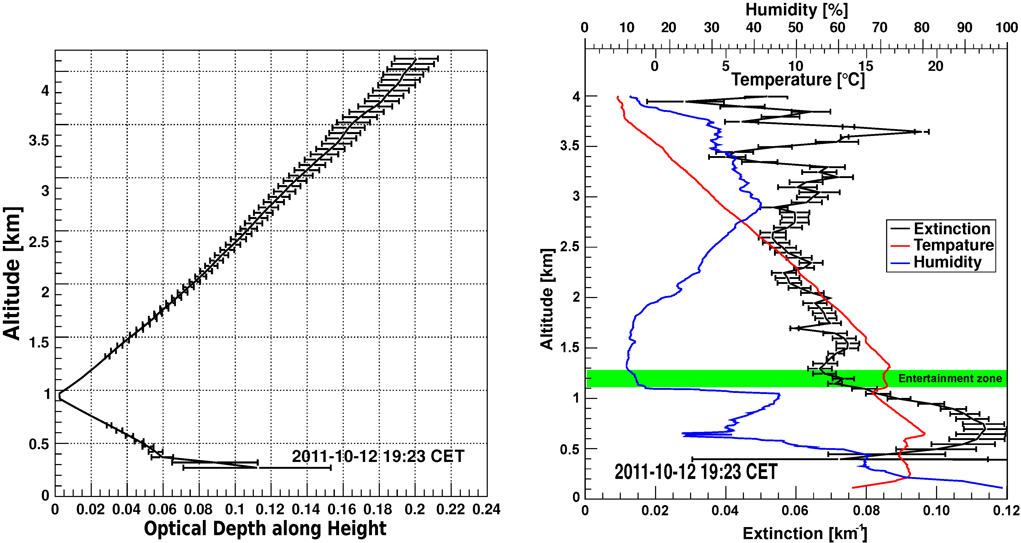 Retrieval results of the aerosol optical depth (left) and aerosol extinction (right) from the performed spatial scan on 12 October 2011 (Figure 4, bottom). The simultaneously-obtained temperature and humidity profiles from radiosonde measurements at Potocˇe are shown for comparison and the determination of the atmospheric boundary layer height. The green bar shows the entertainment zone determined by the LiDAR and radiosonde joint measurements. Altitude is given relative to the vertical distance above the sea level.