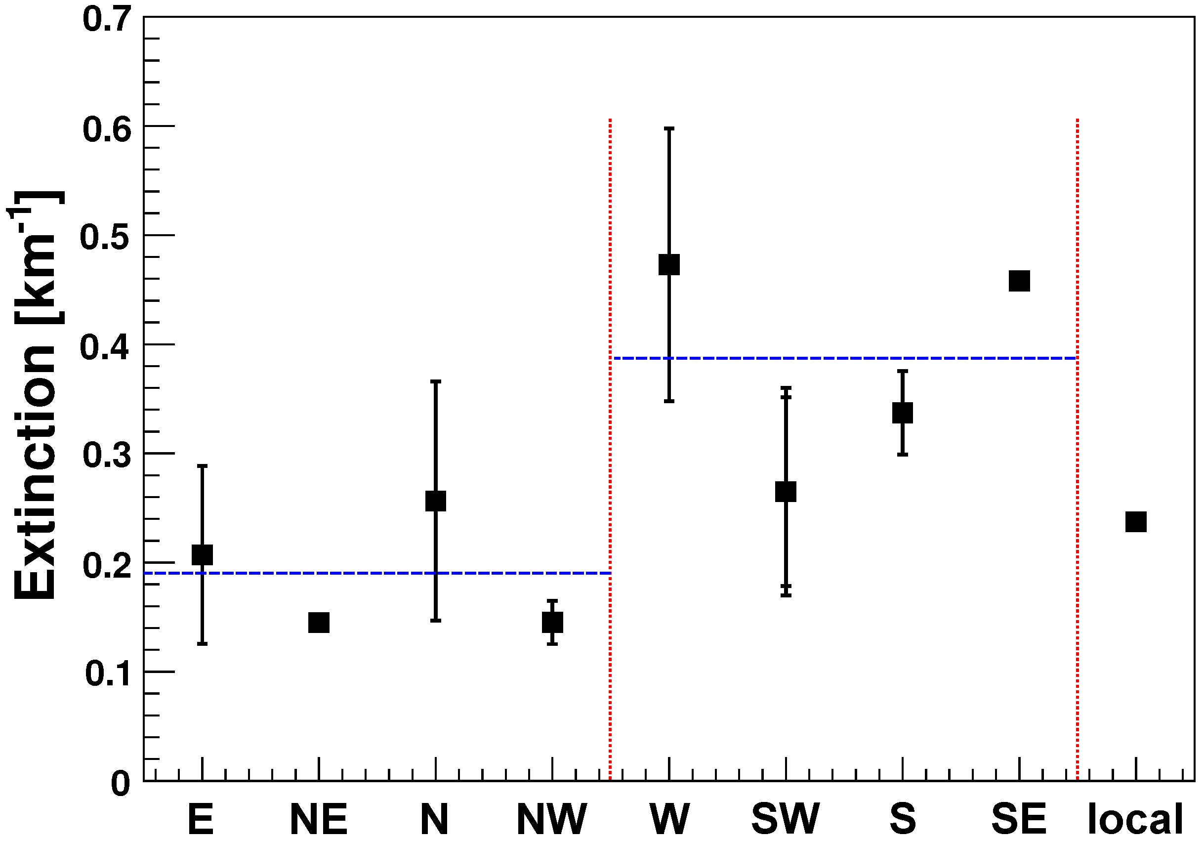 Considering that air flow directions at the heights of 1.0 km, 1.5 km and 2.0 km were almost the same, we used the air mass class from the height of 2 km for the analysis of aerosol extinction. The mean aerosol extinction within the ABL for each of the nine classes is shown in Figure 9. Two groups of classes with different characteristics were found: one includes the E, NE, N and NW classes, which exhibited small average aerosol extinction values (< 0.26 km−1); the other group comprises the W, SW, S and SE classes with large average aerosol extinction values (> 0.27 km−1). The average value of aerosol extinction in the first group was around 0.2 km−1, which agreed with the presence of land-based air masses from the European continent. The average value of aerosol extinction in the second group was two-times larger (0.4 km−1), which could be the result of the influence of marine aerosols from the Mediterranean or Adriatic Sea.