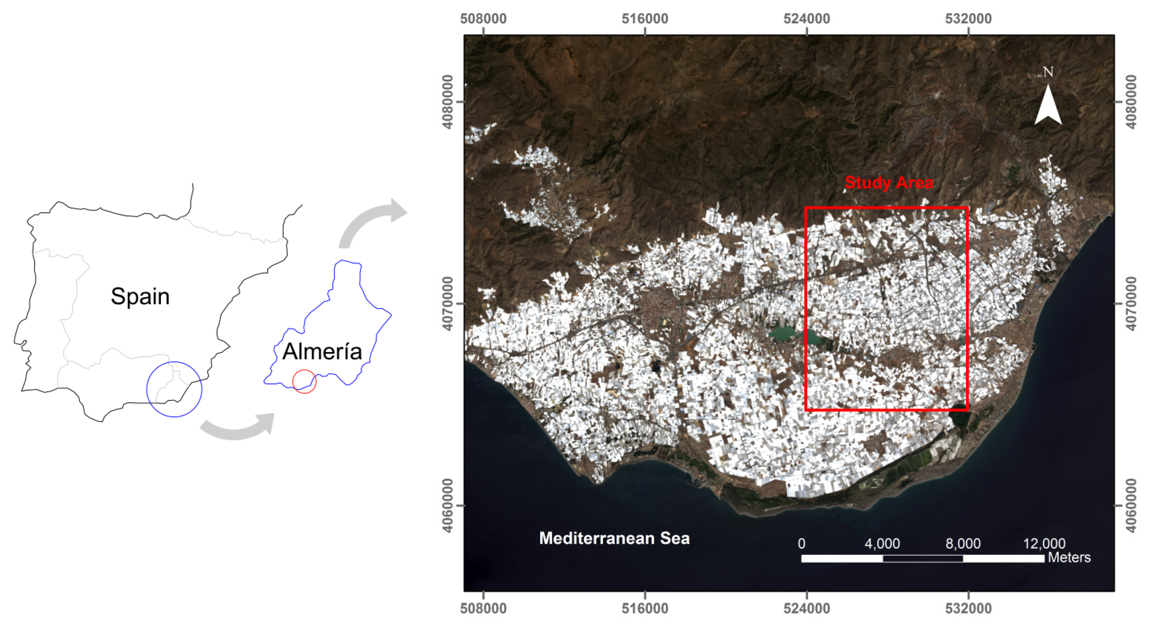 This investigation was conducted in Almería, southern Spain, which has become the site of the greatest concentration of greenhouses in the world, known as the “Sea of Plastic” or the “Poniente” region. The study area comprises a rectangle area of about 8000 ha centered on the WGS84 geographic coordinates of 36.7824°N and 2.6867°W (Figure 1).
