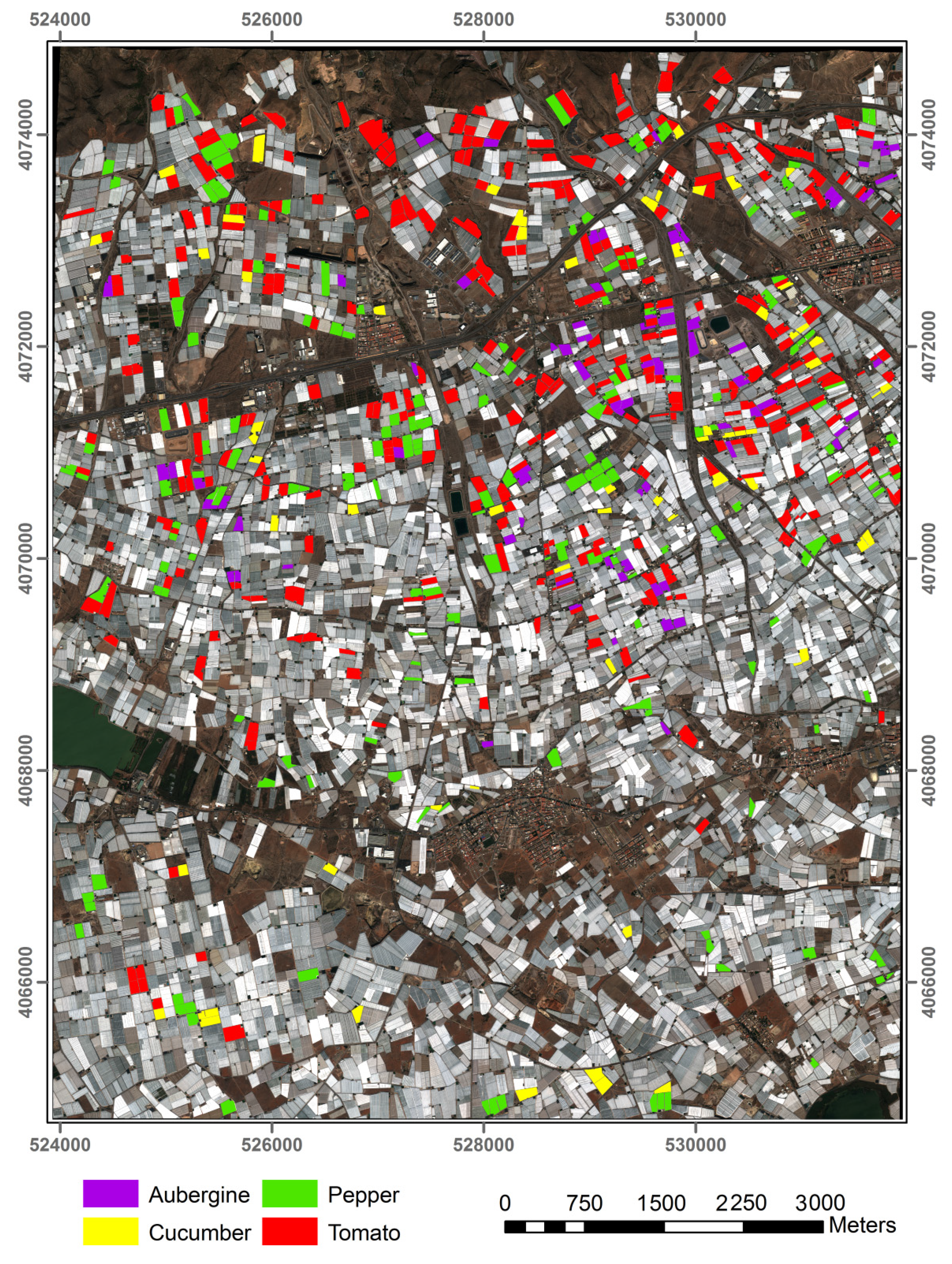 The practice of using plastic materials to advance the first harvest and increase the yield of horticultural crops has been steadily increasing during the past 60 years in the entire world [1]. Perhaps nowhere this process is more visible than around Almería, southern Spain, where agriculture under plastic has become a key economic driver. However, this productive sector is being affected by an unstable and changing geopolitical situation of the markets. In this regard, facts, such as the entry into force of the new agricultural agreement between the European Union (EU) and The Kingdom of Morocco adopted in 2012, which liberalizes EU-Morocco trade in agriculture (Council Decision of 8 March 2012, 2012/497/EU), or, more recently, the Russian veto of horticultural products from the EU, are causing important changes in the market prices of products grown under plastic-covered greenhouses, which significantly affect farmers and agribusiness. In order to alleviate these changes in market prices, each agricultural cooperative in Almería is carrying out a crop acreage plan to be applied by their farmers. However, a more globalized planning of horticultural production would be desirable. Certainly, the possibility of knowing the crops that are being grown under greenhouses along an agricultural campaign, both focused on our local productive sector and our direct competitors, would help decision making in order to keep prices up, thus maximizing returns to farmers. In that sense, useful information for decision makers would include cropland extent, crop types, crop rotation dynamics, and so forth [2]. This sort of information over space and time can be repeatedly, consistently and accurately acquired by methods relying on remote sensing without exception [3]. In fact, remote sensing can significantly contribute to providing a timely and accurate picture of the agricultural sector, as it is very suitable for gathering information over large areas with high revisit frequency [4].