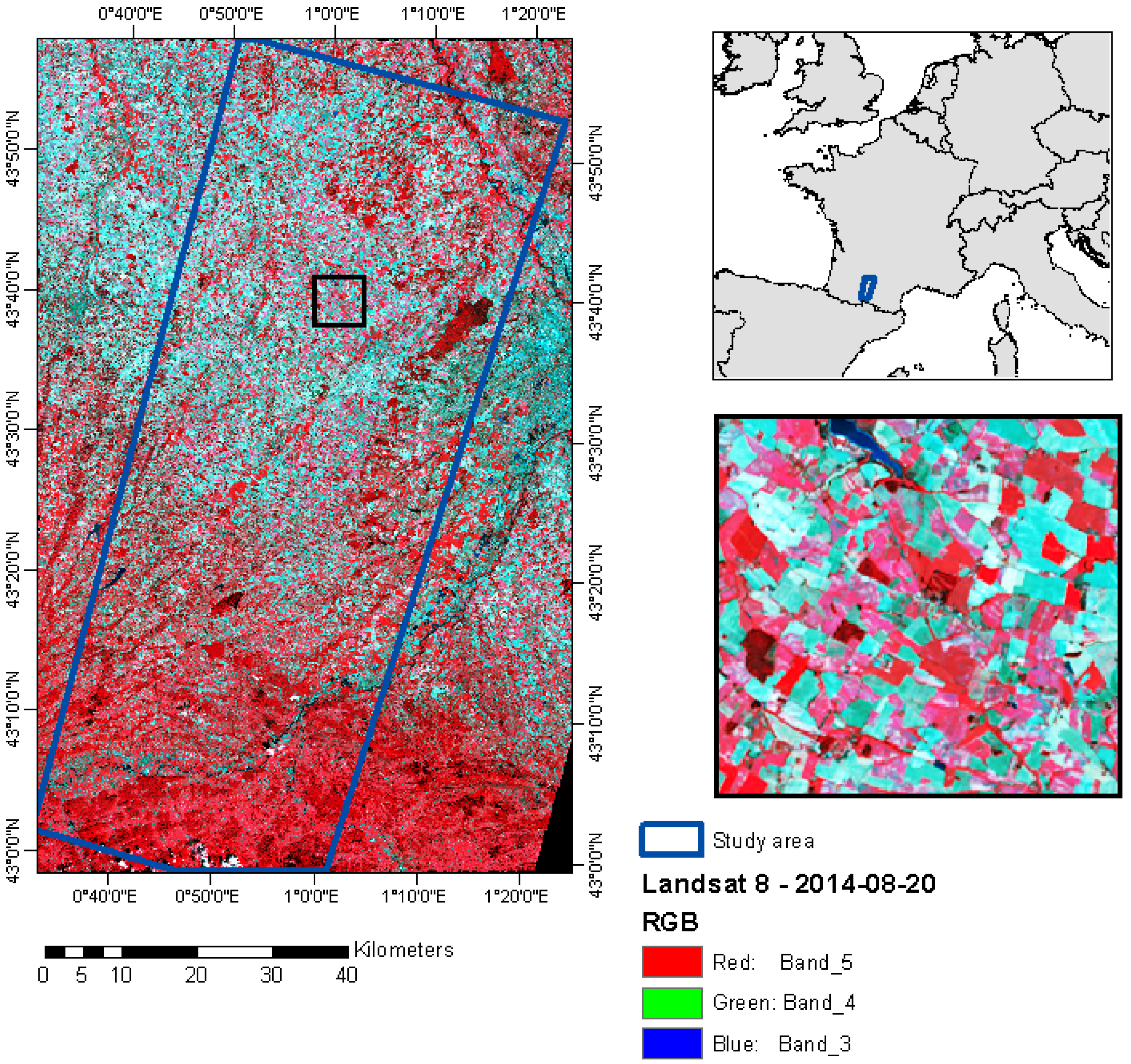 Location of the study site in southwest France. The blue box represents the study area. The background image is a Landsat-8 False Color Composite of 20 August 2014.