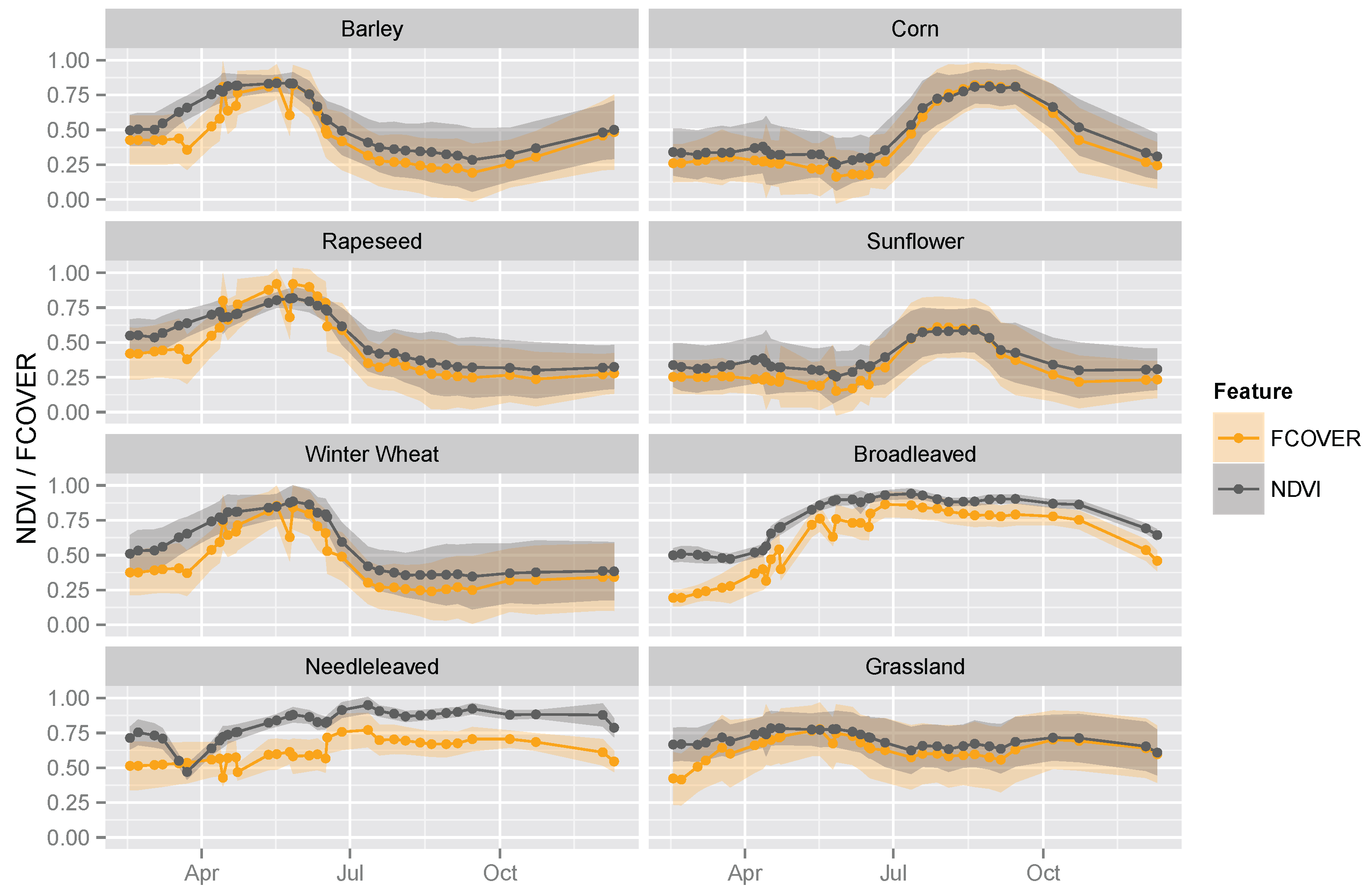 FCOVER of winter crops—barley, rapeseed and wheat—increases from the end of March until the end of May, and begins to decrease from June, which is consistent with the growing cycle. Despite some minor differences of the average values, their temporal profiles appear very similar. Summer crops—corn and sunflower—reach a maximum FCOVER at the end of August and the end of July, respectively. FCOVER of grassland rises from the end of February to the start of June and then declines slightly from June to the end of the year. Similar seasonal profiles can be observed for broadleaved and needle-leaved forests. From the temporal consistency viewpoint, FAPAR and LAI show profiles that are very much alike for all classes. The drop in NDVI for the needle-leaved forest at the beginning of the season might be due to spurious interpolation caused by high cloudiness. If the temporal dynamic appears consistent for all biophysical variables, an enlargement of the variability of the time series compared to the NDVI is noticeable.