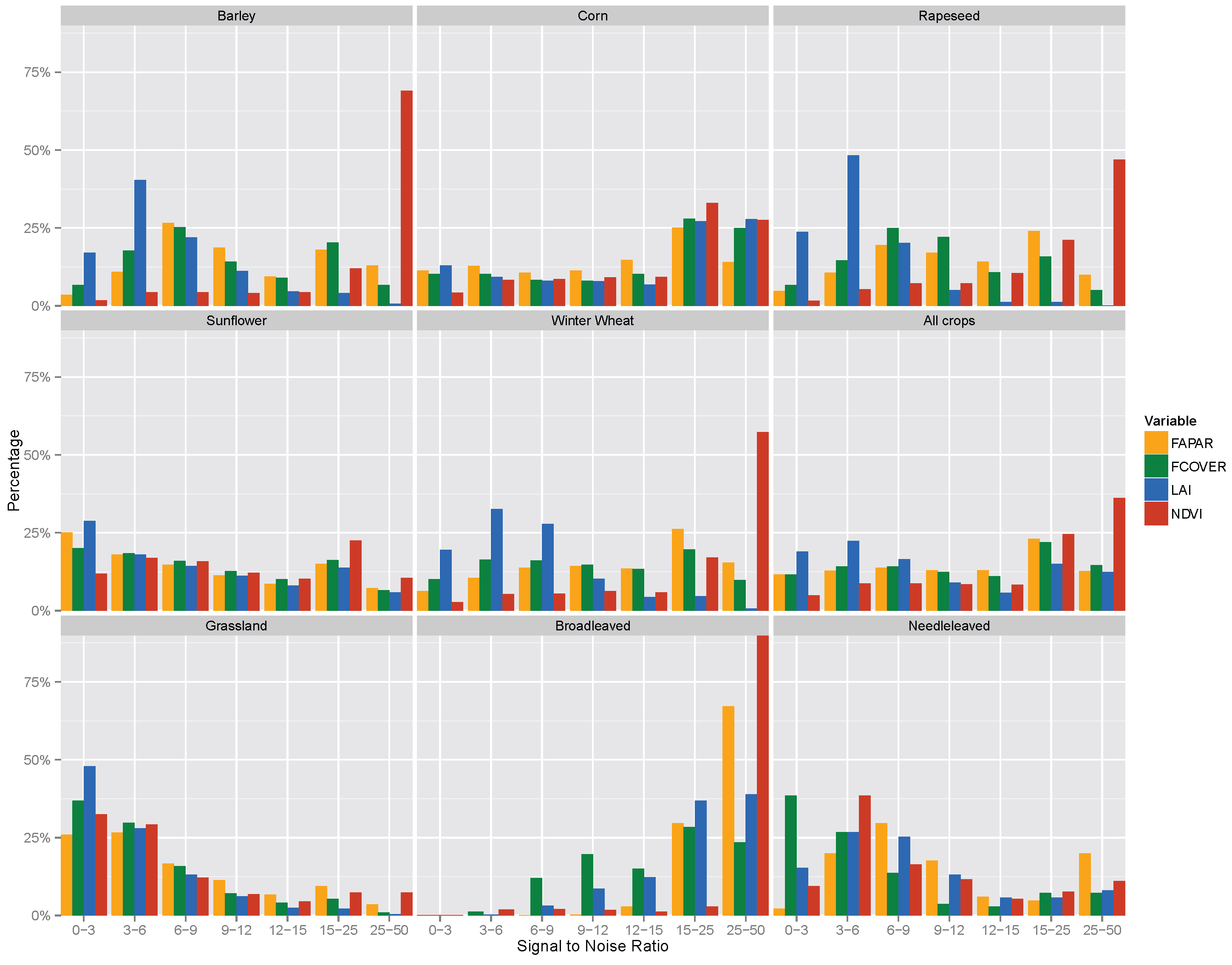 Distributions of the class-specific signal-to-noise ratio were extracted at the pixel level for all biophysical variables and the NDVI (Figure 4) and show contrasting distribution patterns: from uniform distributions (sunflower) to growing or decreasing exponential distributions (broadleaf forest and grassland) and a normal (barley) distribution. Winter crops tend to have high ratio values for NDVI, and yet, distributions of biophysical variables are associated with lower values, especially LAI. All biophysical variables, as well as the NDVI have similar distributions for summer crops and forest classes. Regardless of the class, the distribution of NDVI signal-to-noise ratio values is shifted towards higher values and, hence, shows more consistency than biophysical variables. This is particularly remarkable for the winter wheat and the barley classes. LAI is the noisiest BPV for crops with a signal-to-noise ratio of nine in comparison to 13 for FAPAR and FCOVER. The combined analysis of the temporal profiles and the signal-to-noise ratio reveals that the retrieval for corn is the most reliable.