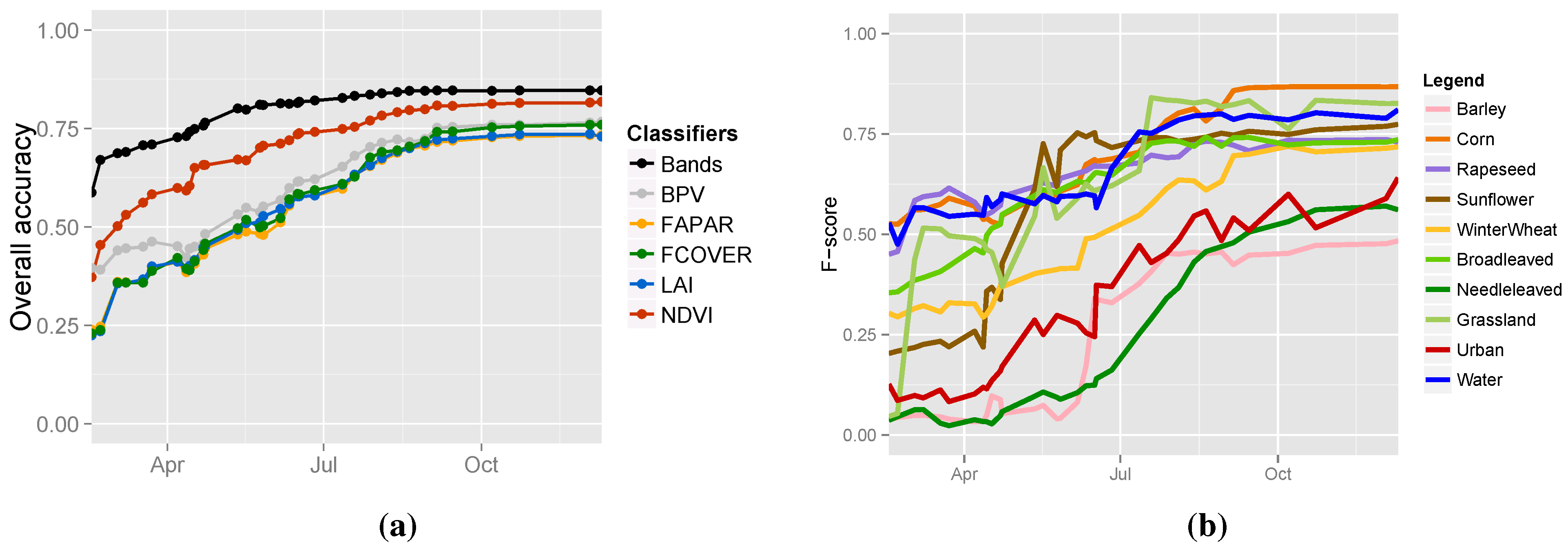 The selected output legend in terms of land cover and crop type distribution includes eleven classes: five crop types (barley, wheat, rapeseed, sunflower and corn), needle-leaved and broadleaved forests, grassland, urban areas and water bodies. As it was shown that the random forest out-of-bag error significantly underestimates error and can differ from independent error estimates [57], the reference data were randomly split into two parts: half of the samples was selected to train random forest classifiers along the season as the remote sensing data accumulates, while the other half served for independent classification accuracy assessment (Table 1). Six classifiers were trained using as input (1) all spectral bands; (2) NDVI; (3) LAI; (4) FAPAR; (5) FCOVER and (6) all three biophysical variables. For the sake of clarity, these classifications are henceforth referred to as Spectral-C, NDVI-C, LAI-C, FAPAR-C, FCOVER-C and BPV-C, respectively.