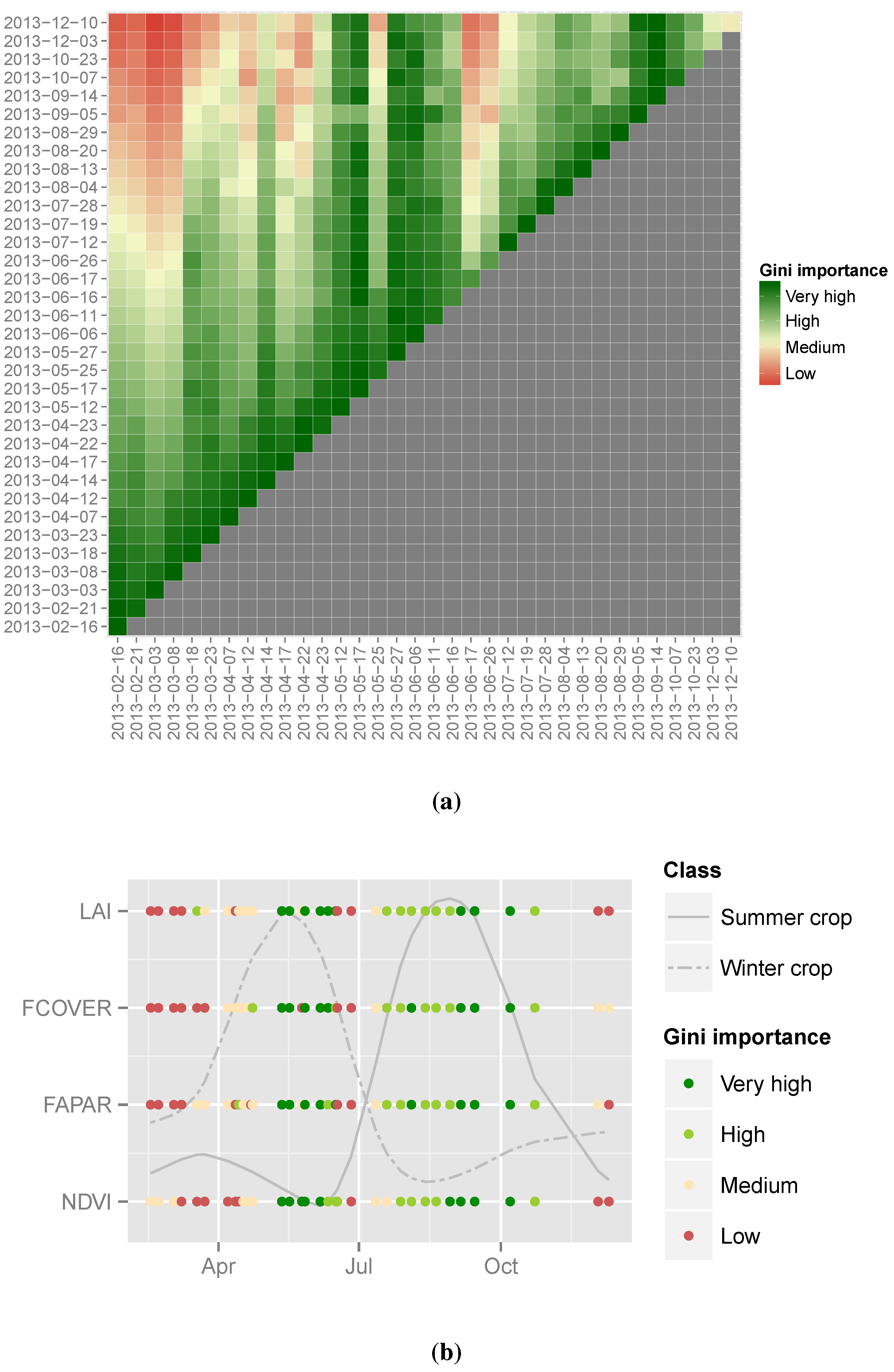 Quantifying the importance of each image acquisition date permits evaluating the optimal image acquisition periods for classification. Amongst the possible alternatives [64,65,66], the mean decrease of the Gini Index (GI) was calculated and stored at each observation (34 dates) and for each classification. To assess the date importance, the random forest turns off one of the acquisition dates and keeps the others constant to evaluate the decline in accuracy using the Gini Index at each node of the random forest [47]. The mean decrease in GI measures the feature importance (acquisition dates in this case): the larger the decrease, the more important the variable. Four categories of importance were determined based on the quartiles of mean decrease Gini values: very high importance, high importance, medium importance and low importance.