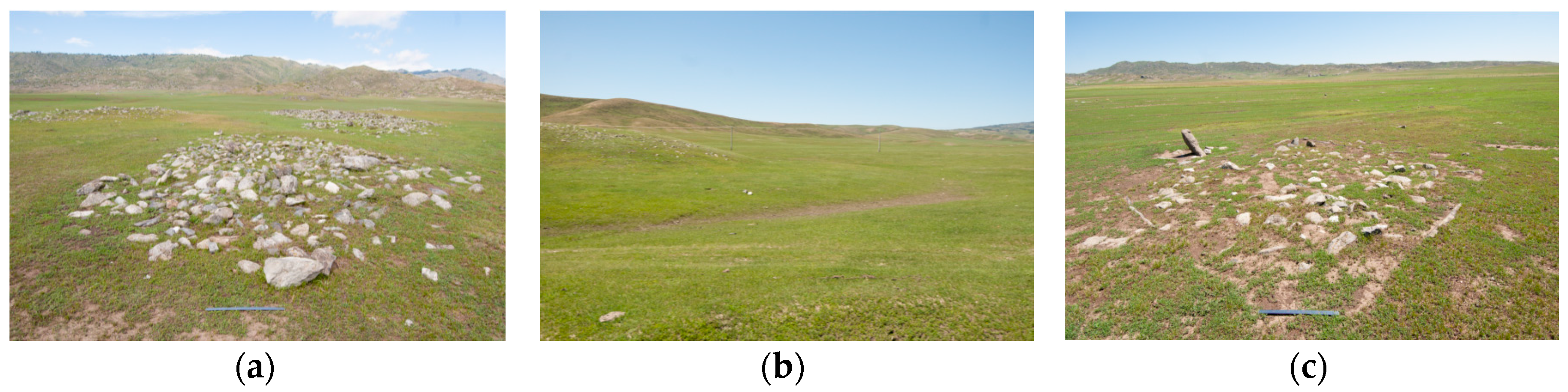 (a) Example of a Scythian kurgan lining up with others of its kind; (b) Example of a Saka kurgan (left side) with a clearly visible ditch; (c) Example of a Turkic ogradka. The scale bar seen in photos (a) and (c) is 50 cm long.