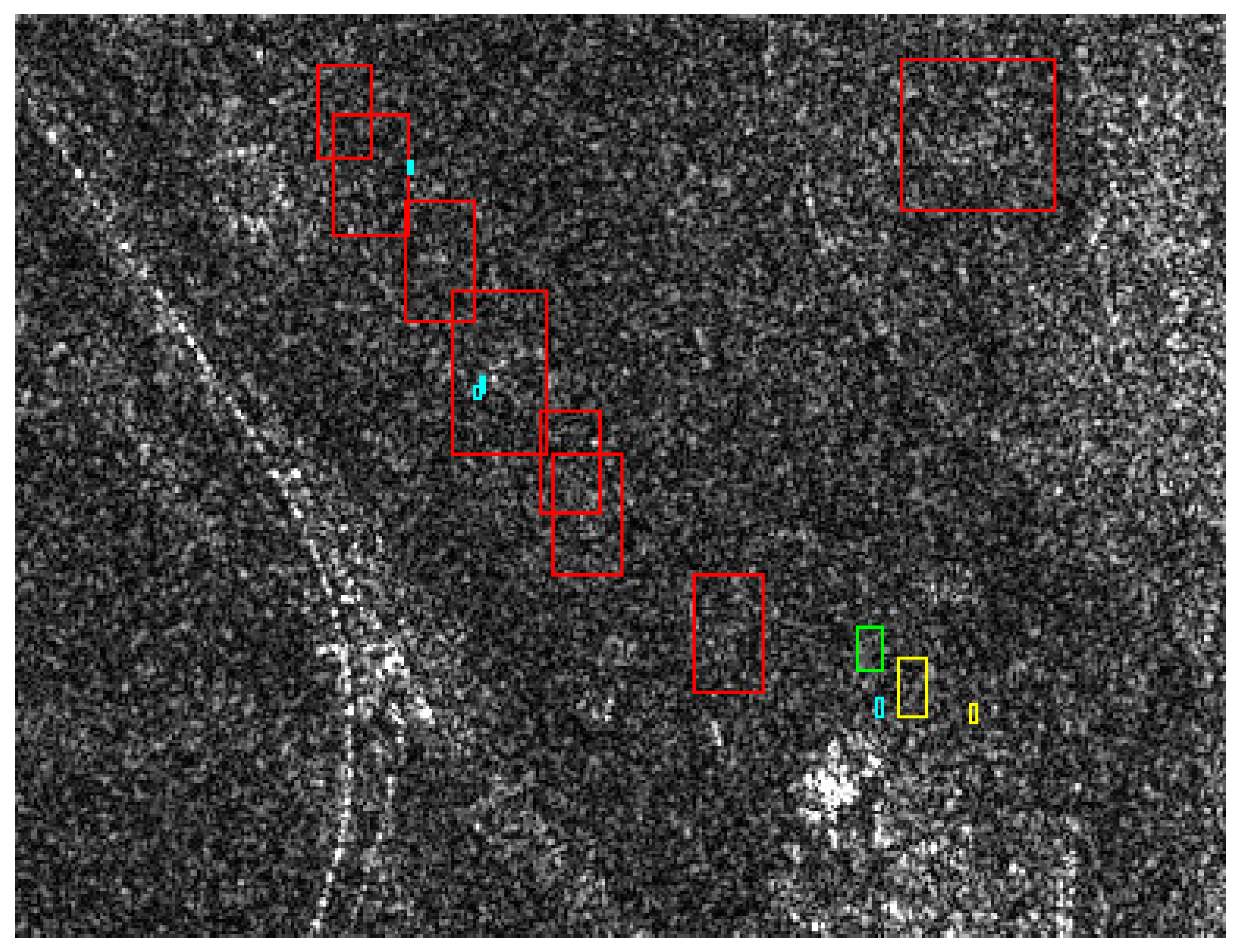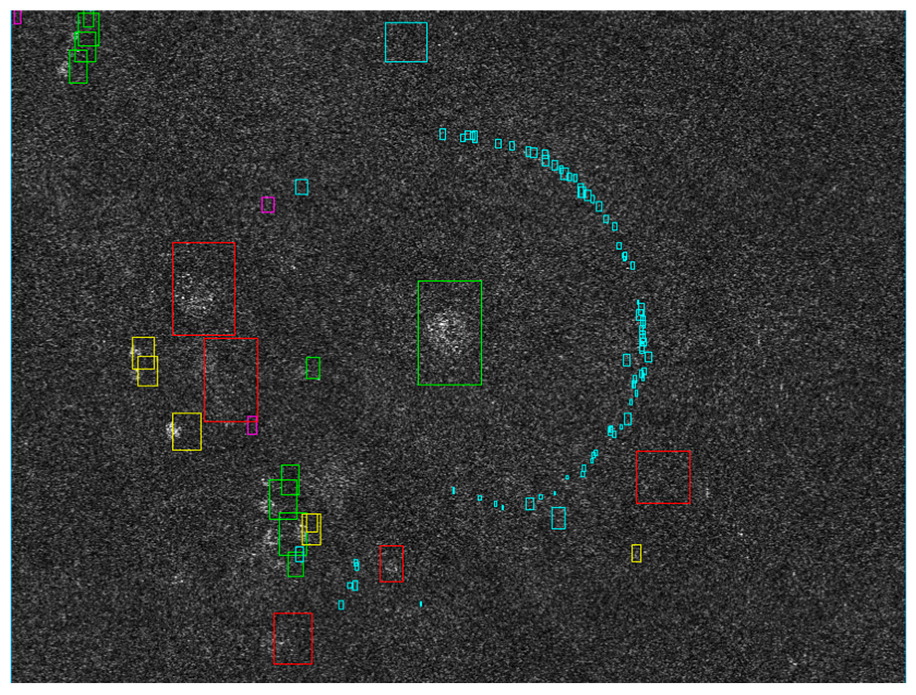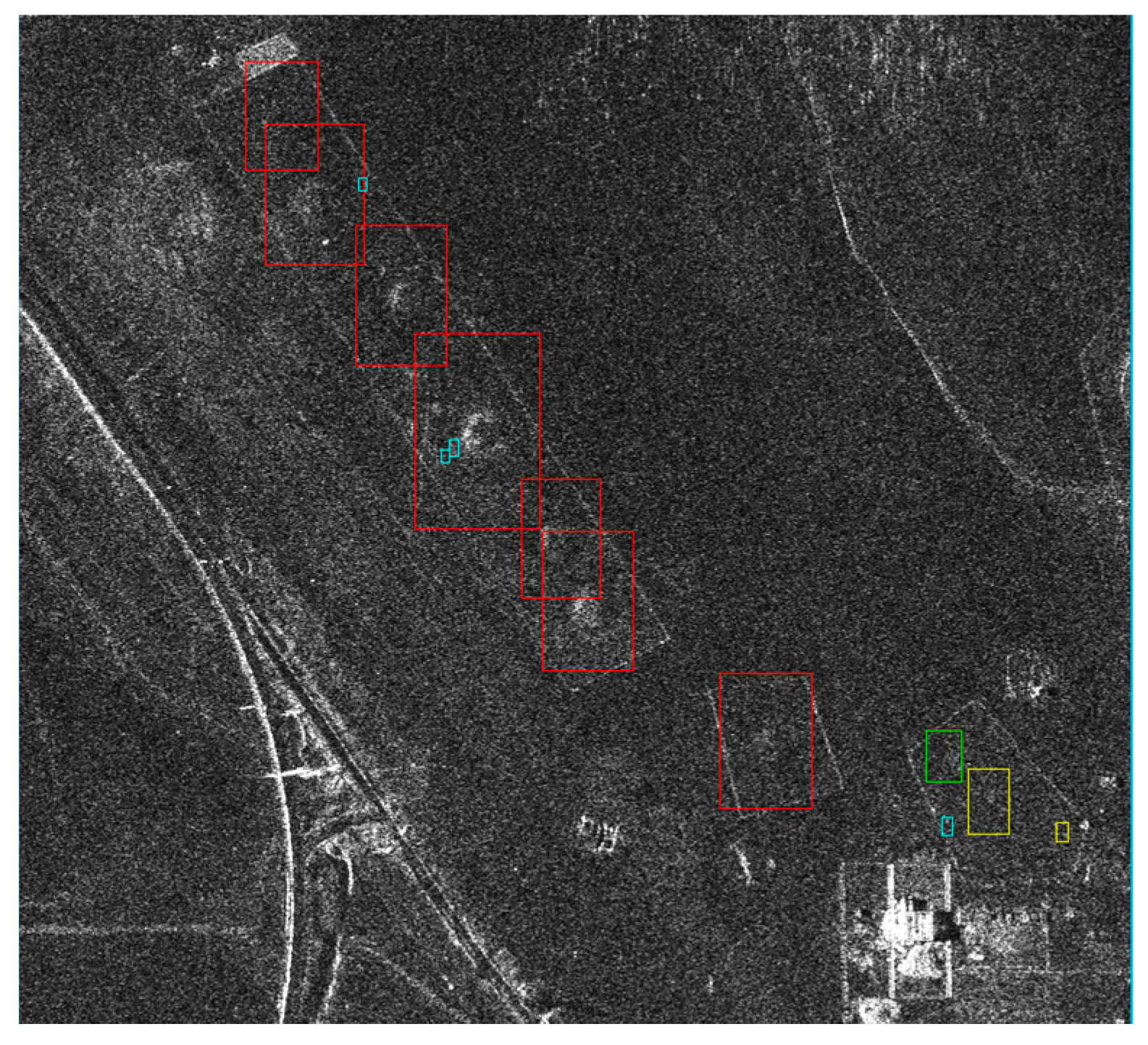As discussed previously, the coordinates from our ground survey were quite good, but there are still shifts and errors; we will analyze these sources of uncertainty in detail in Section 4. After transforming the coordinates in the radar coordinate system based on the Range-Doppler model using the height information from the GPS measurements, and including the dry-atmosphere path delay information from the TerraSAR-X headers (see [13]), we marked Saka kurgans with a red rectangle, Scythian kurgans with a green rectangle, ogradkas in purple, undatable mounds in yellow and all other objects in cyan.