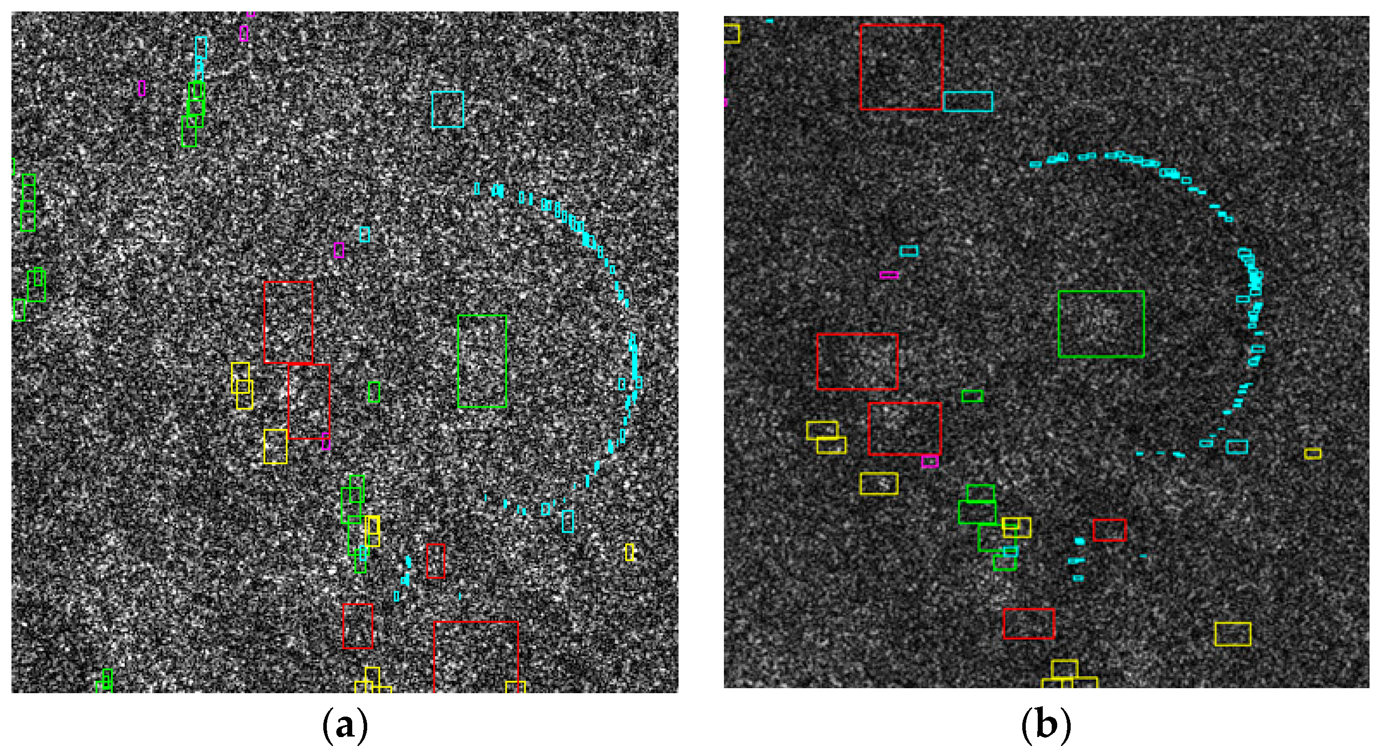 Cluster of Scythian kurgans, Saka kurgans, and ogradkas in the TSX SL images from 12 July 2015 (a) and 14 July 2015 (b)—flipped vertically and horizontally for better comparability (SAR image © DLR, 2015). (Saka kurgans = red, Scythian kurgans = green rectangle, ogradkas = purple, undatable mounds = yellow, and all other objects = cyan).