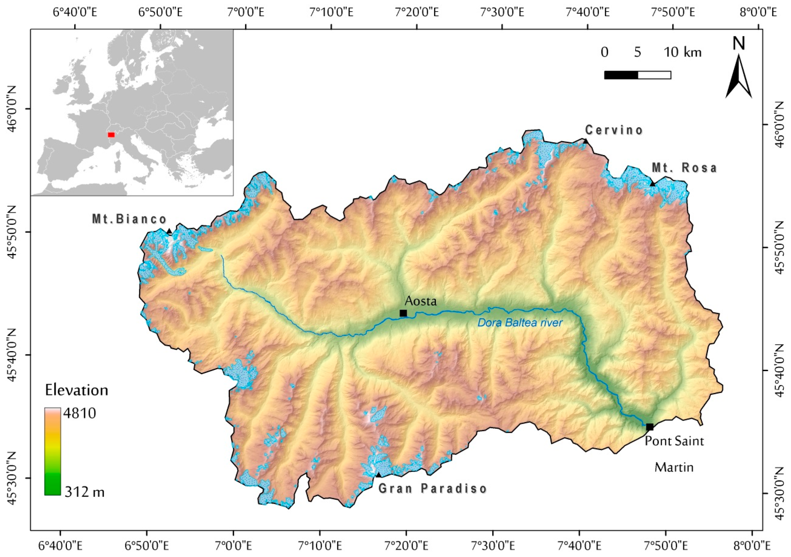 The Valle d’Aosta region (3200 km2) is located in the Northwestern Italian Alps (Figure 1). More than 50% of the Valle d’Aosta (VDA) territory has an elevation above 2000 m a.s.l., though topographic relief is highly variable, ranging from 300 m a.s.l. to peaks higher than 4000 m a.s.l. (e.g., Mt. Bianco, 4810 m a.s.l.; Mt. Rosa, 4635 m a.s.l.; Cervino, 4478 m a.s.l.: Gran Paradiso, 4061 m a.s.l.).