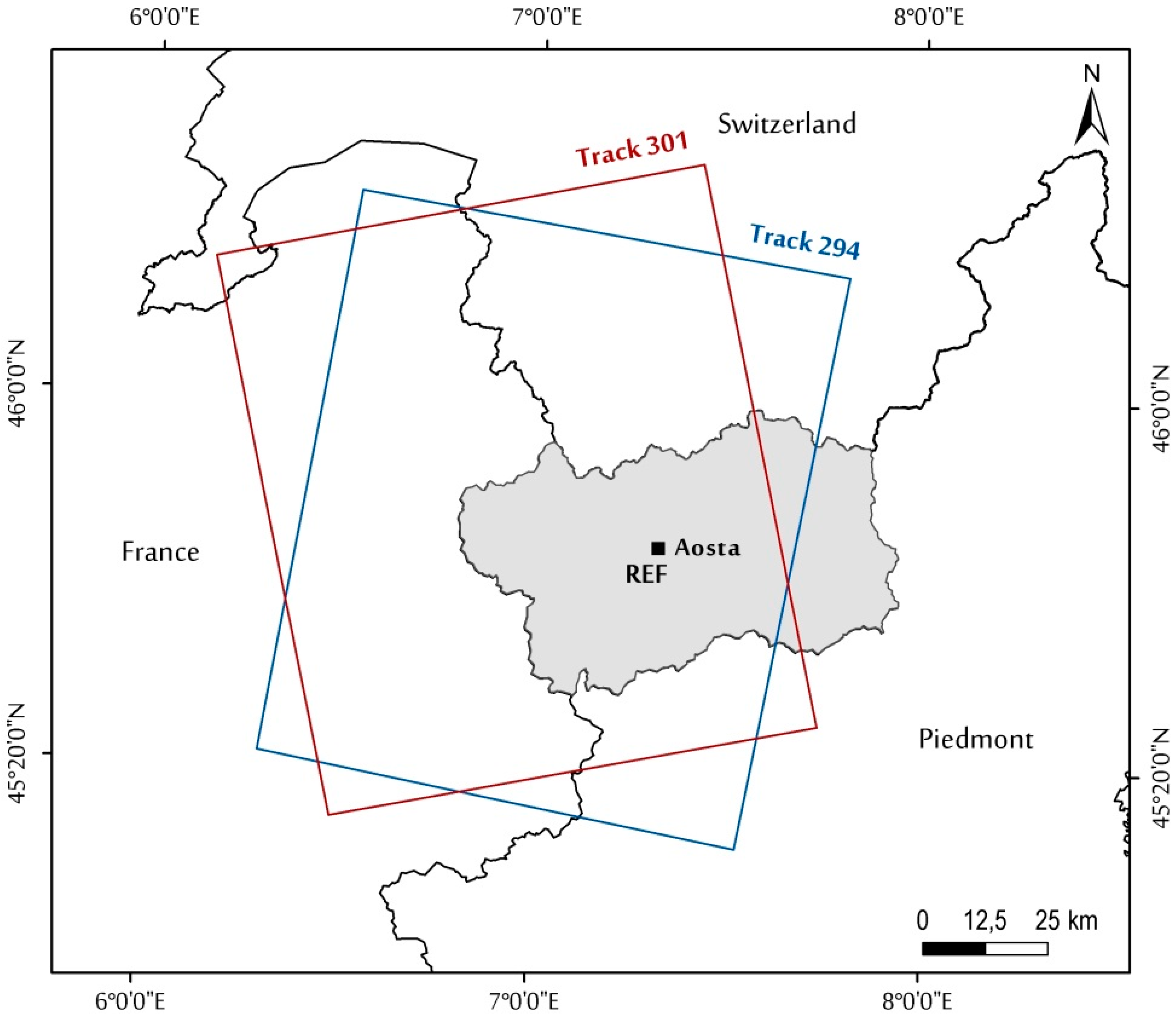 Map of the VDA region study area (in light grey). The red box represents the extent of ERS-1/2 and ASAR Envisat track in ascending orbit, while the blue box represents the track in descending orbit. The reference point (REF) is located in the Aosta municipality.
