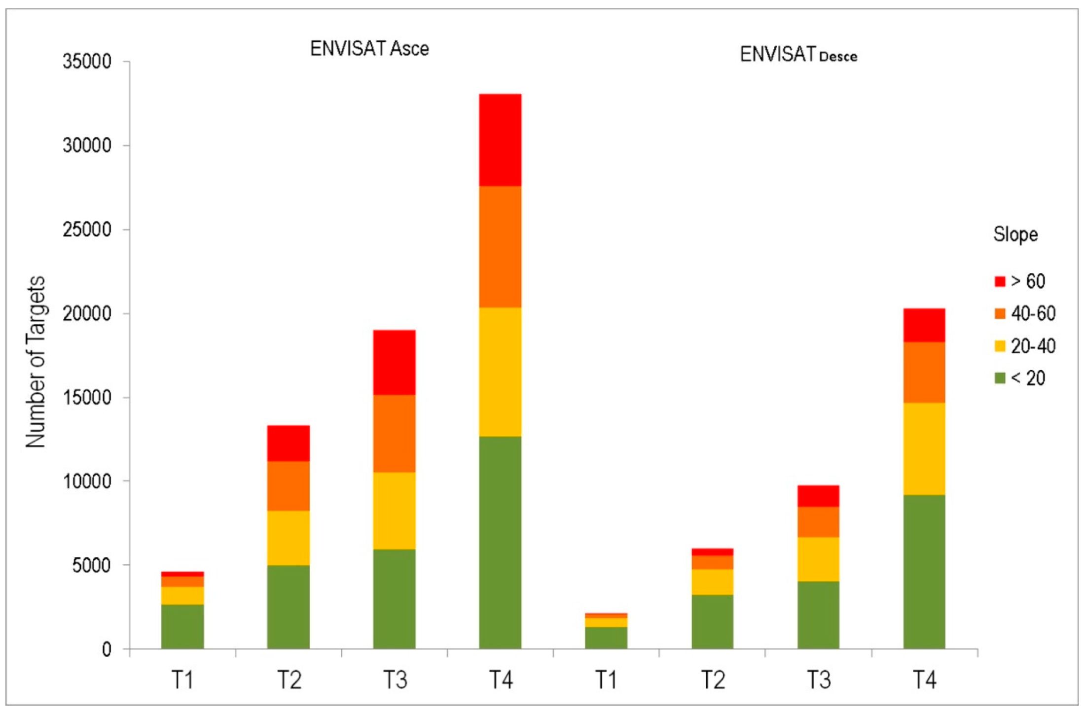 Graph of the number of targets of each dataset available for the Envisat satellite for each task processed. The targets are subdivided and classified with respect four slope classes, based on the slope calculation of the VDA region.