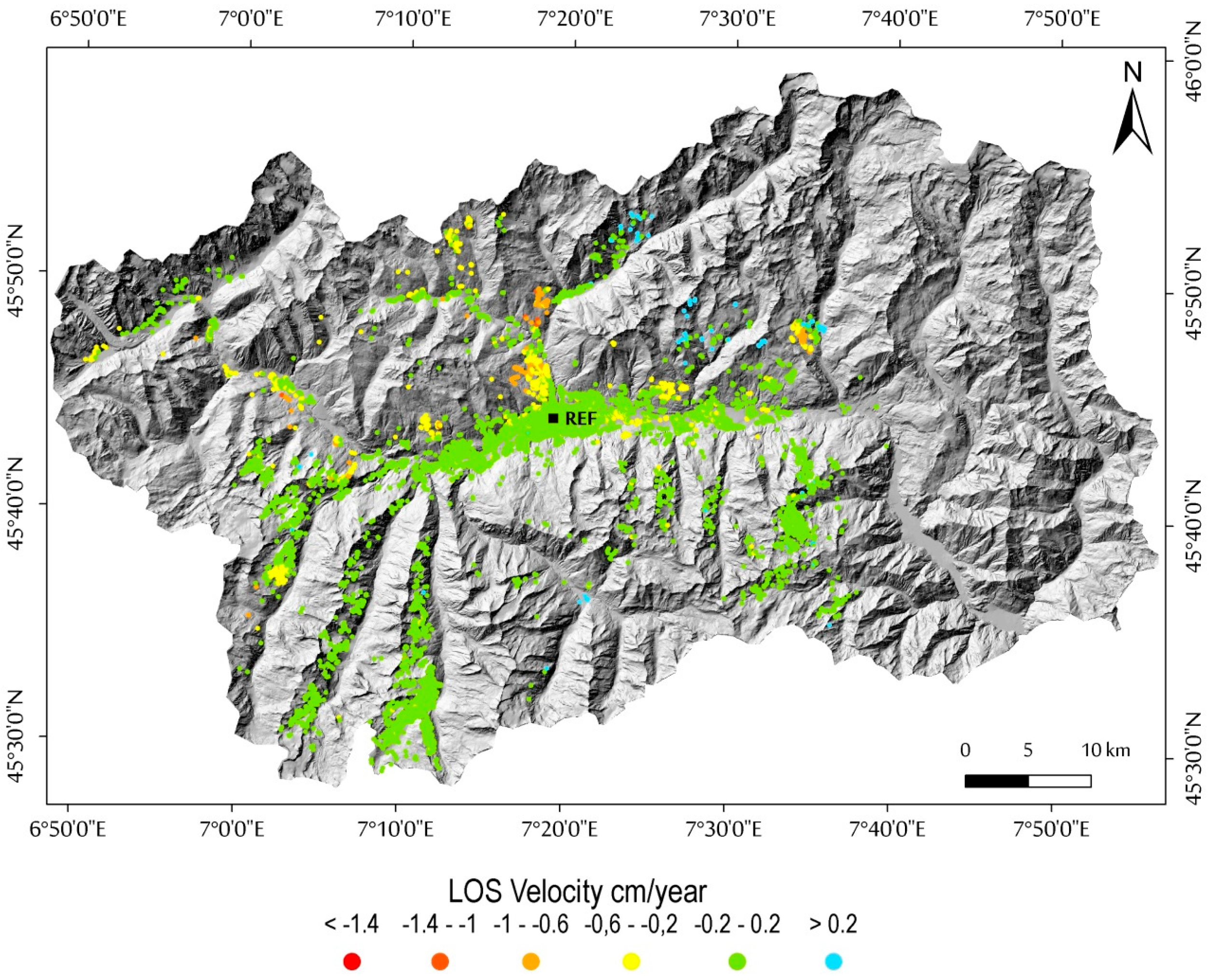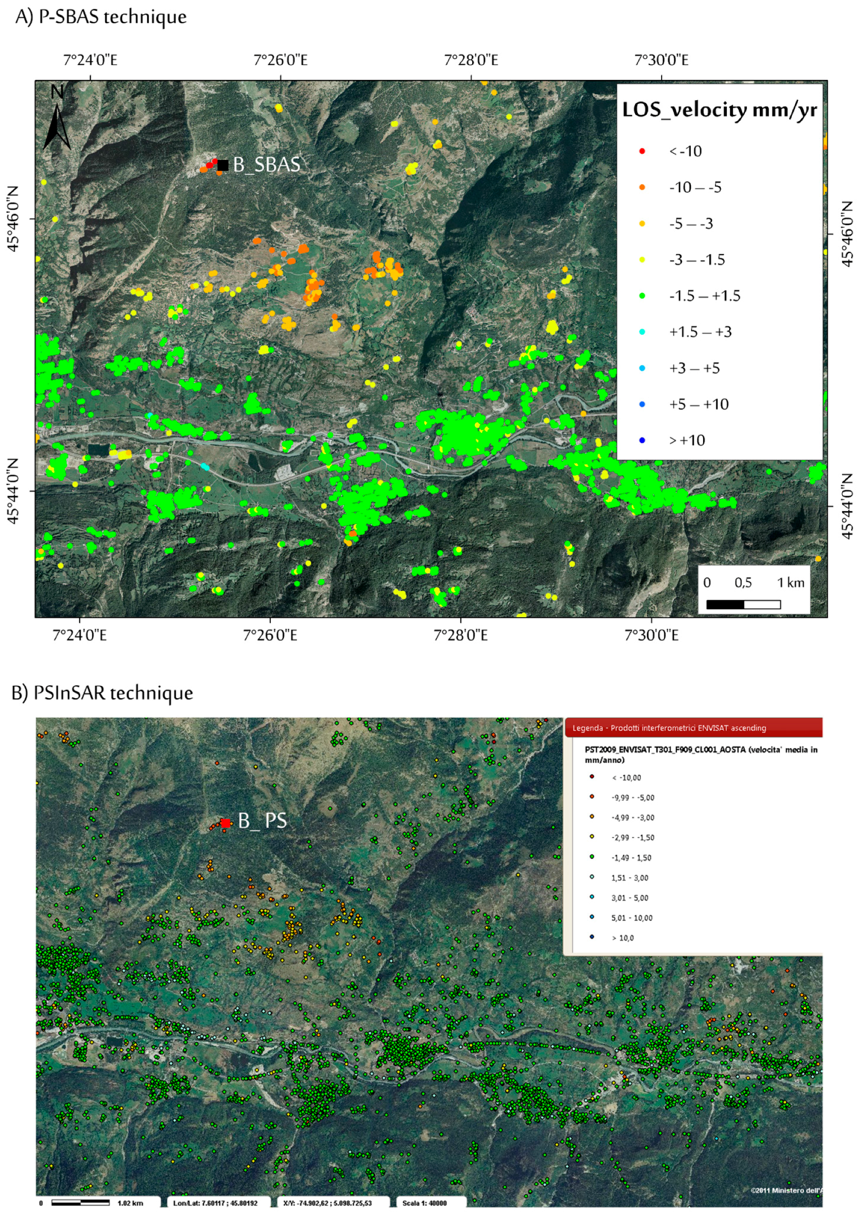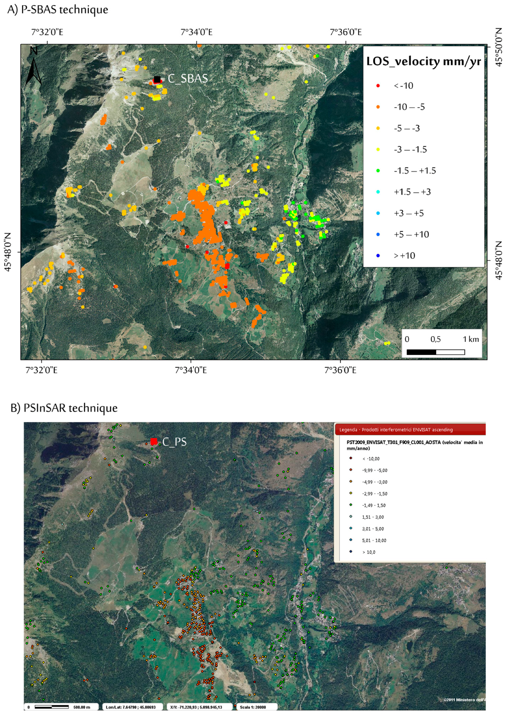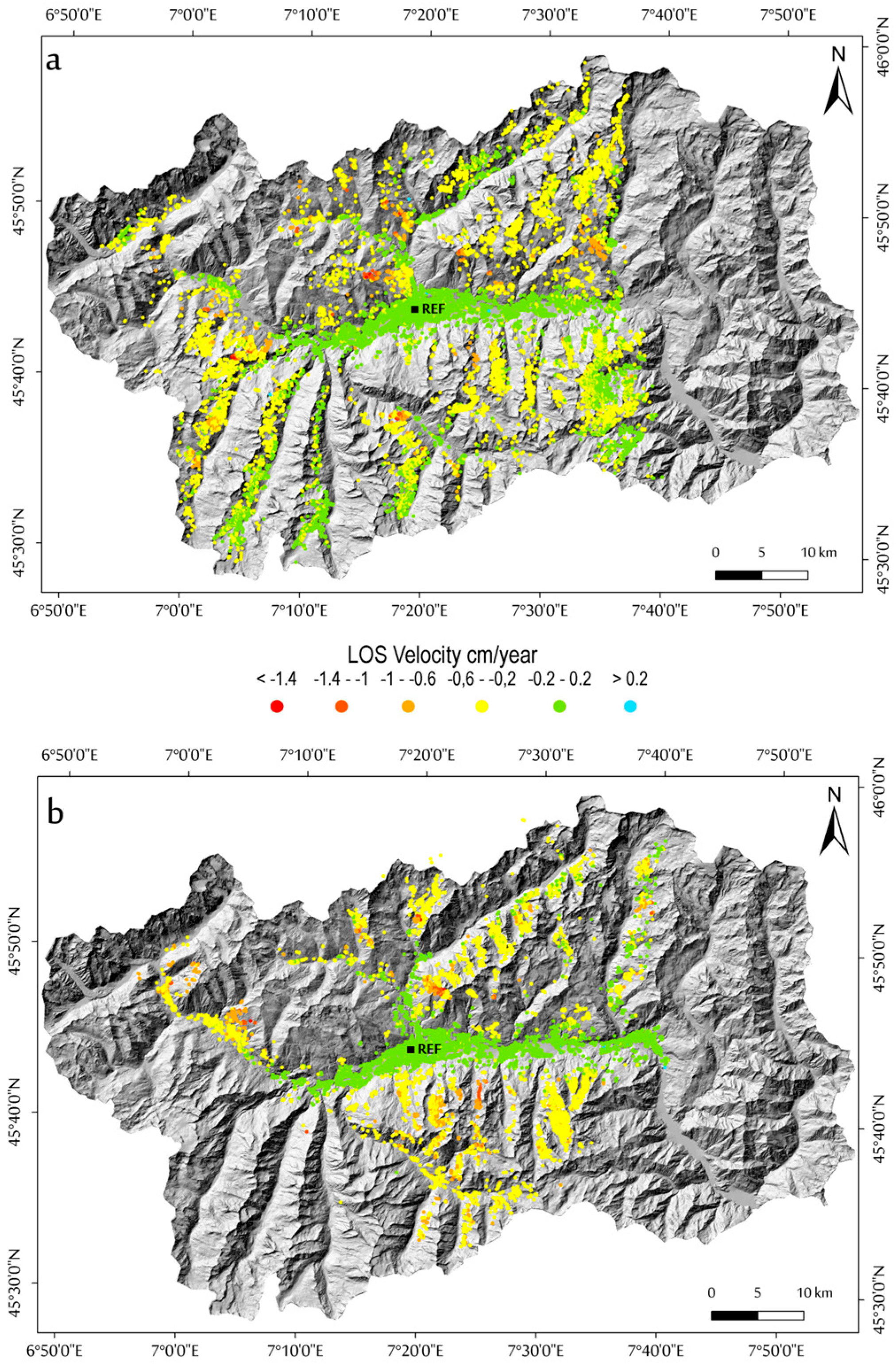 In Figure 6 and Figure 7, we present the best results obtained for both Envisat (ascending and descending orbits) and ERS (ascending orbit) datasets (see also Figure S1). Coherent targets are mainly located at the main valley bottom, where urbanized areas (e.g., streets, railway, main towns, hamlets, and isolated building) are located. Within the observed period, LOS velocities in these areas are rather small, ranging from about ±0.2 cm/year and comparable between Envisat and ERS processes, confirming an overall ground stability. Relative to the ERS-1/2 dataset, directly processed on the basis of the results achieved with the Envisat analysis, a significantly lower data coverage respect to the Envisat resulted, presenting a total amount of targets of 8574. As expected from the SAR visibility analysis performed (see Figure 2), coherent target distribution is mainly on east-facing slopes, in ascending orbit, and on west-facing slopes, in descending orbit. Moreover, in the valleys, targets are mainly localized in hamlets and villages, as well as in areas of little or no vegetation (e.g., talus, moraine, and bare rock).