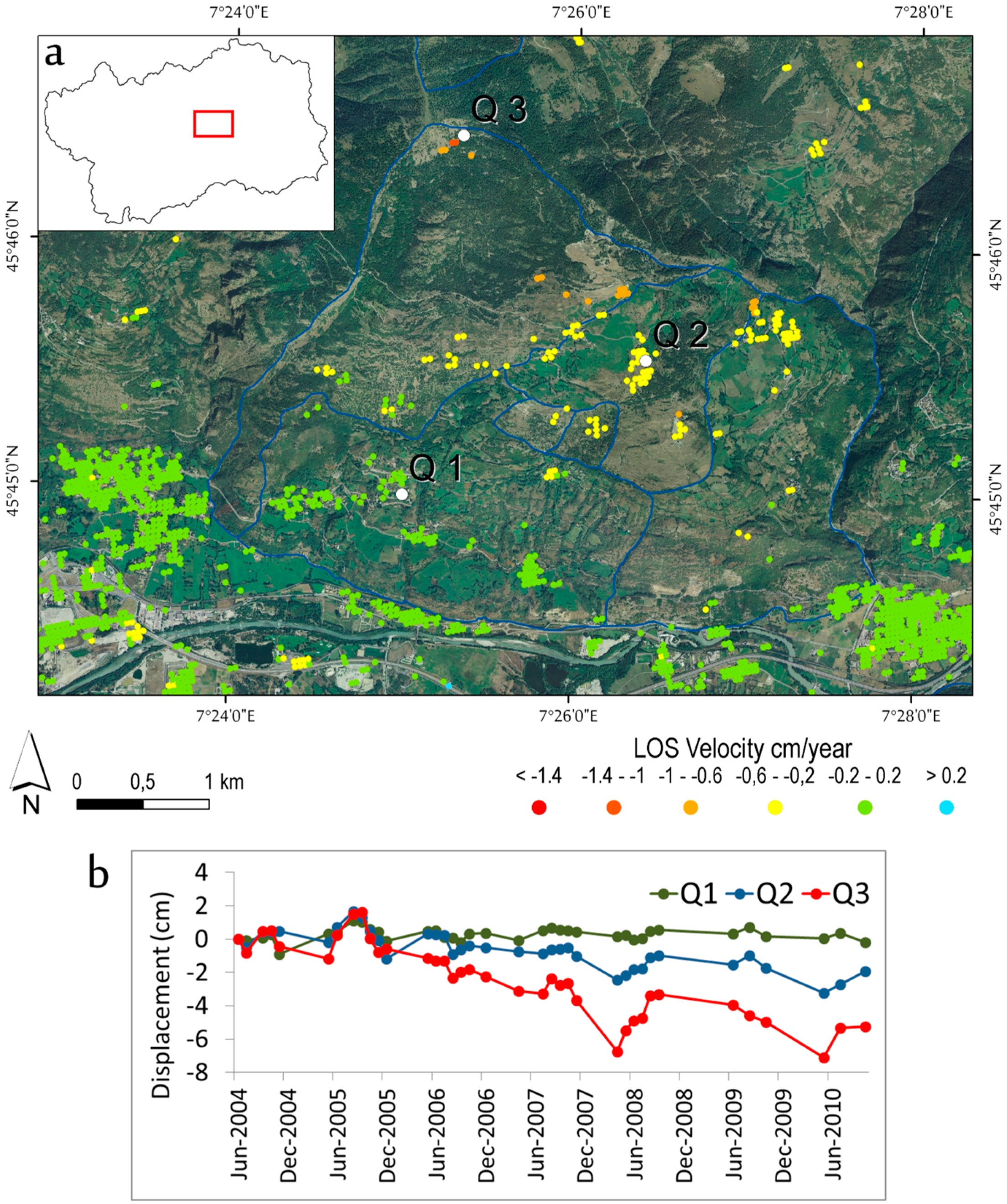 The DsGSD of Quart is located on the north side of the broad middle portion of the principal valley. This phenomenon covers an area of about 13 km2 from 530 m a.s.l. at the valley bottom up to 2200 m a.s.l., in the terminal part of the main DsGSD scarp. In [10], the complex evolution of this phenomenon is described, and the ongoing deformation was attributed to an interaction between gravitational movements with glacial and fluvial processes operating over a long time period.