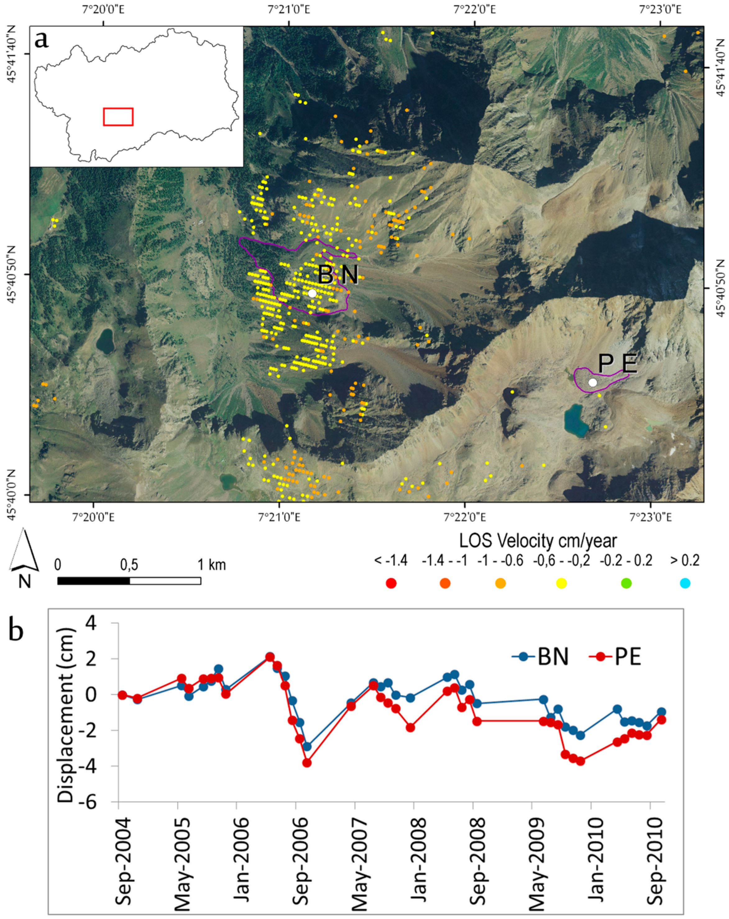 (a) Mean deformation velocity map of the Becca de Nona (BN) and Petit Emilius (PE) rock glaciers in descending orbit; (b) time series corresponding to the targets signed by the white dots in the map.