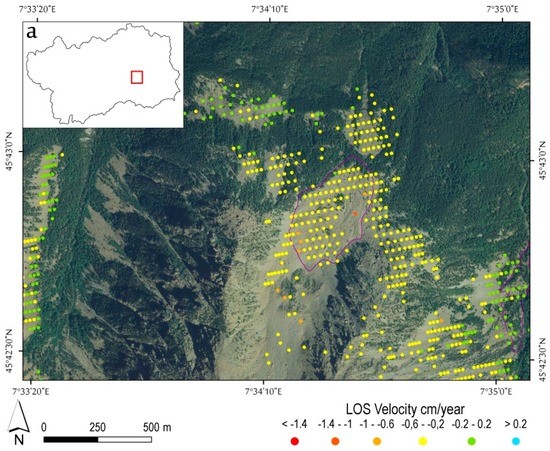 The possibility to investigate surface deformation over wide areas with sub-centimeter accuracy can be very useful for the interpretation of the kinematic behavior of mass wasting phenomena typical of high mountain region (e.g., landslides, rock glaciers, and glaciers). However, the high complex relief, together with the land use and the snow cover, typical of mountainous areas, constitute important limitations for the DInSAR processing applications [42,43,44,86], also associated to the well-known intrinsic limitations of these techniques [33,45,46].