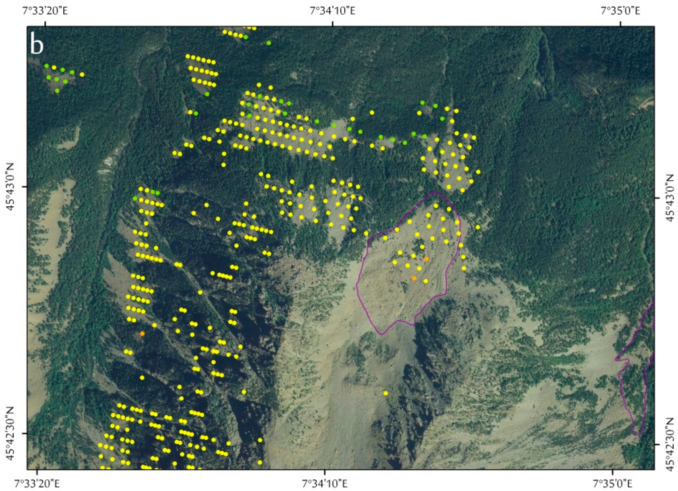 Exploiting our results (Figure 8a), we noted a good density of the target distribution, higher than that in other DsGSDs. The target distribution mainly covers the upper-northern and the central sector, while no targets were revealed in the southern part and in general at the DsGSD toe, where only a small basal portion of the landslide close to the dam structure is covered. The distribution of the targets is influenced by the distribution of bedrock outcrops: in the area covered by grassland or woods, the number of targets is very poor.