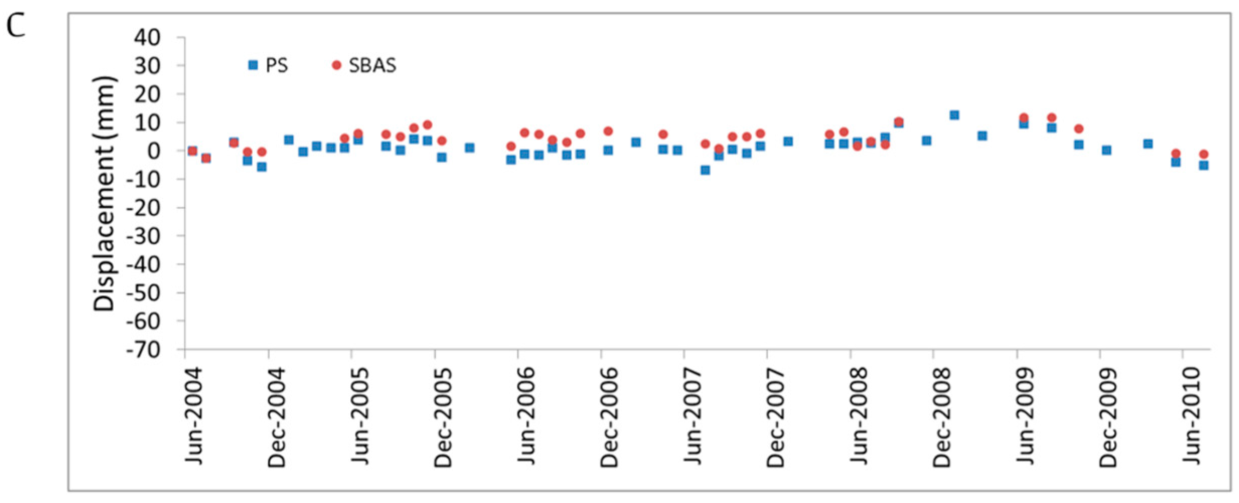 Advanced DInSAR methods have been developed to derive ground velocity maps and displacement time series [33,34,35]. The small baseline subset (SBAS) technique [34], which combines sets of interferograms with small orbital separation (baseline) and short revisiting time to reduce the temporal decorrelation and maximize the number of coherent SAR targets, has proven to be suitable in different deformation scenarios [36,37,38,39]. Accuracies are in the order of 1 mm/year for mean surface velocities and 5 mm for displacement measurements [40].