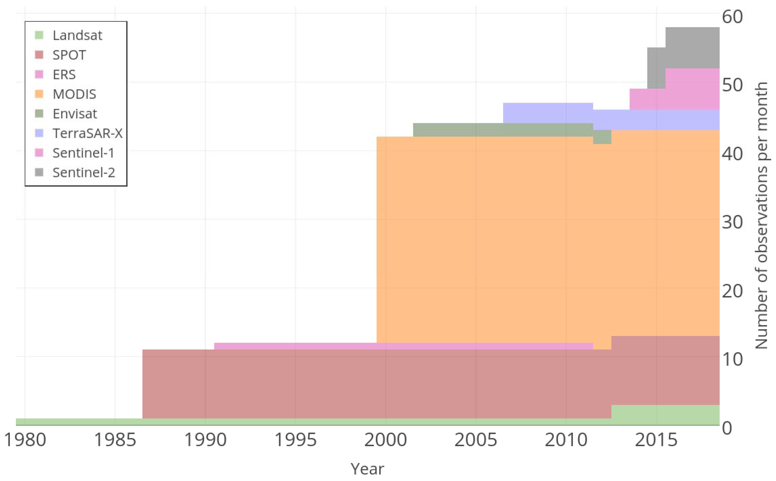 The number of available satellite images has improved significantly over the last three decades. In this figure, the variety of spatial resolution in the different missions is not considered.