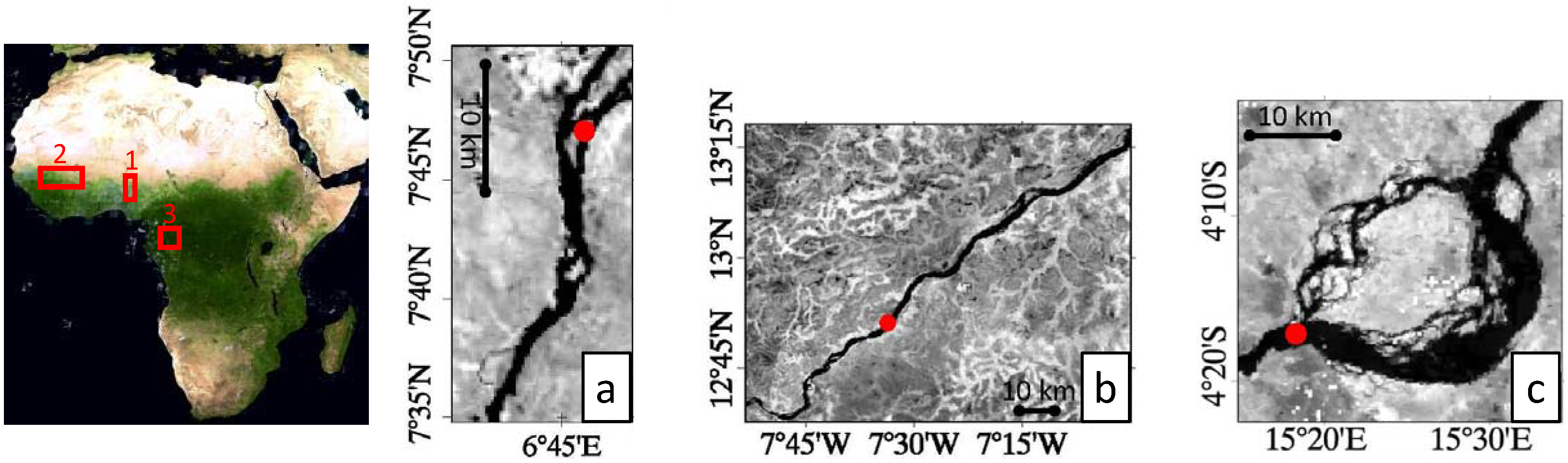 To analyze the performance of the proposed automatic river area extraction algorithm from satellite images in different situations, we select three different river sections in Africa (Figure 2).