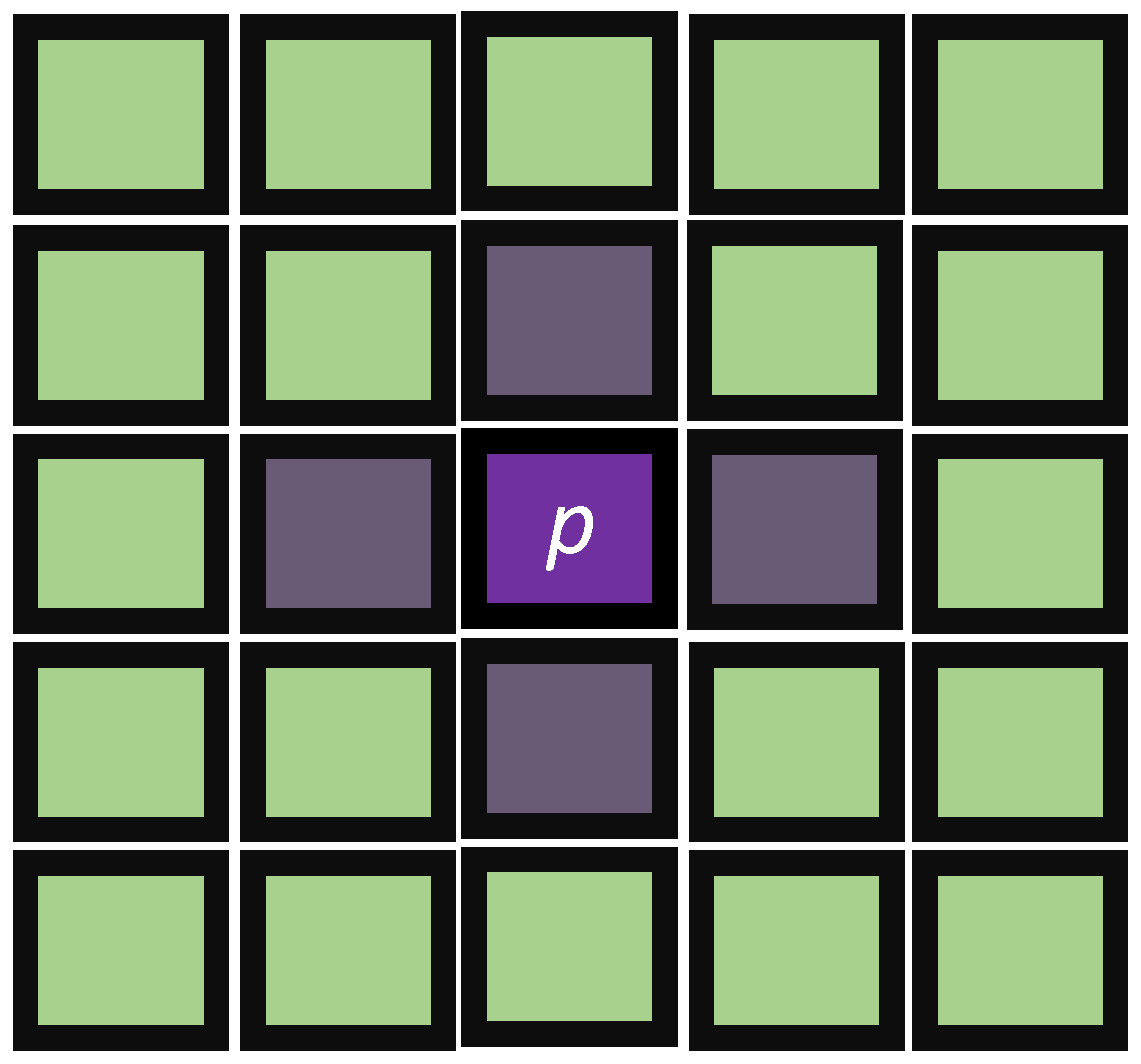 | : | a neighborhood system where is a subset of the pixels in located adjacent to the pixel p (Figure 3 is an example of a four-neighbor structure for pixel p). To provide a smoother result, one can think of a bigger neighborhood system. |