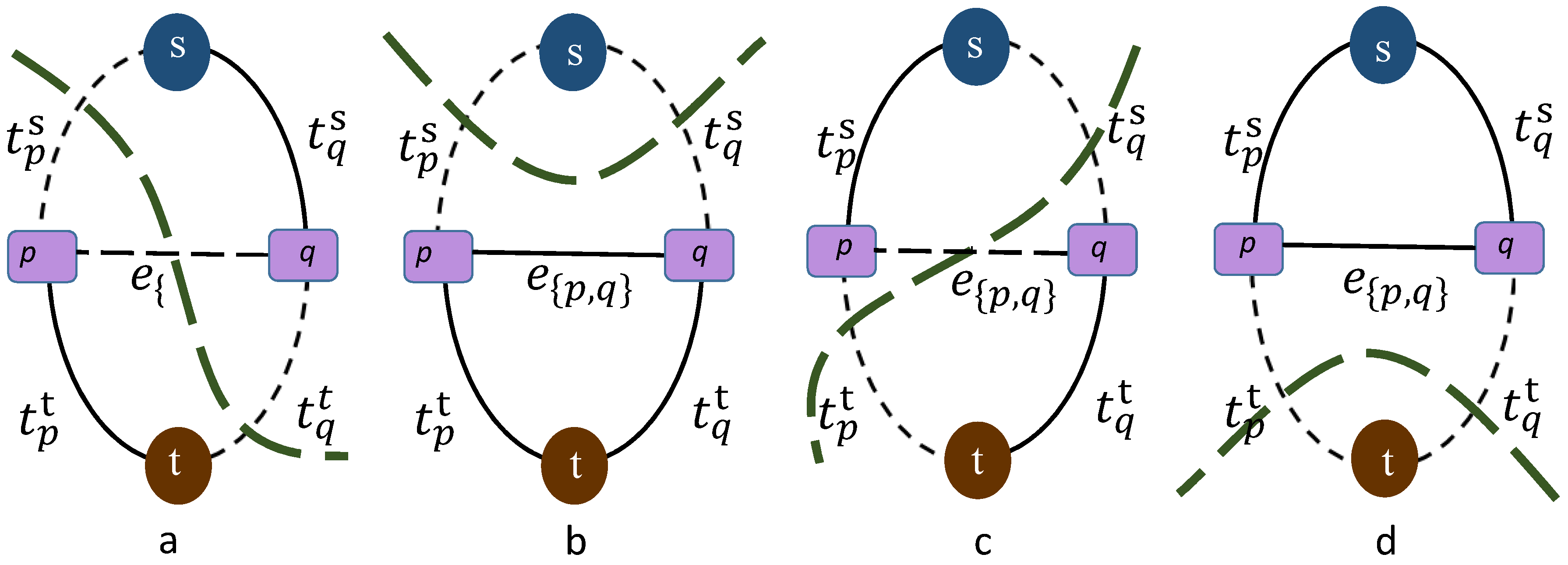 A graph with only two pixels in one dimension. Here we have four vertices (two pixels: p and q; two terminals: s and t) and five edges (four terminal links (t-links): , , , ; and one neighbor link (n-link): ).