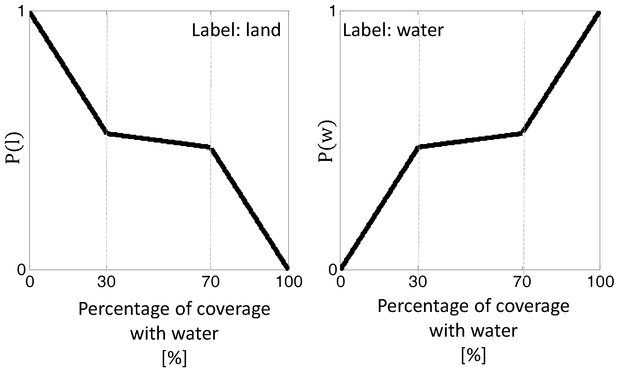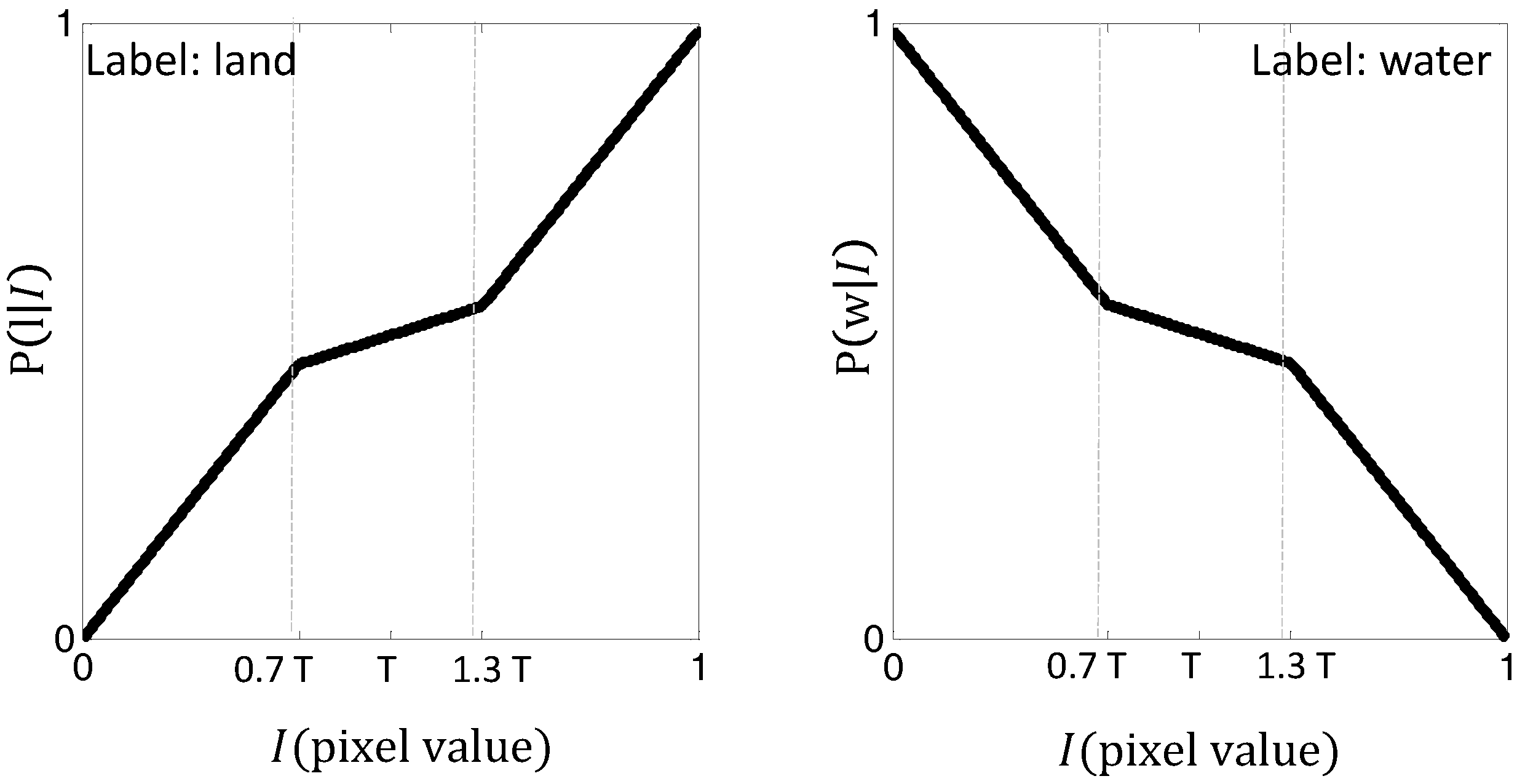 | : | the set of possible labels that can be assigned to a pixel (water or land). |