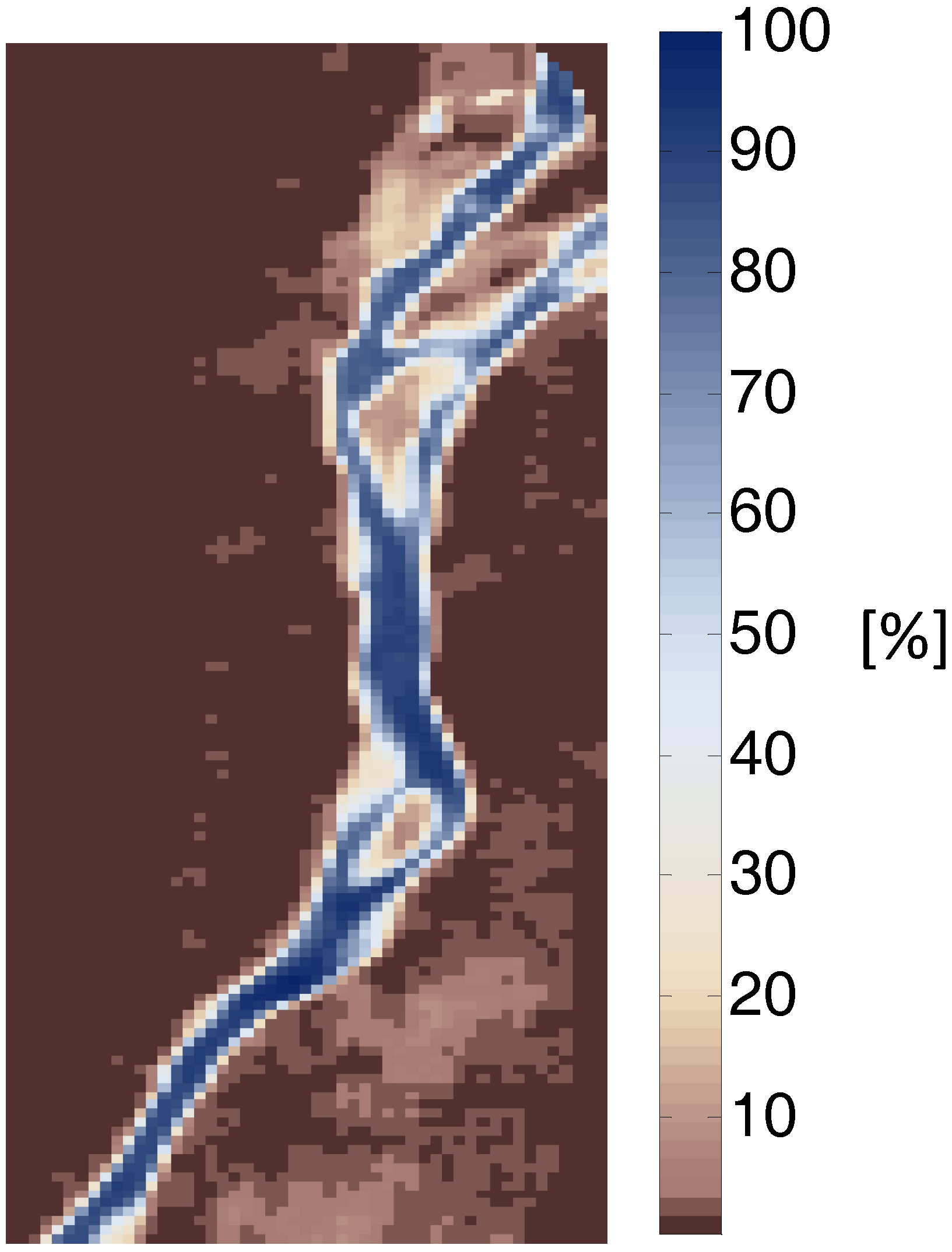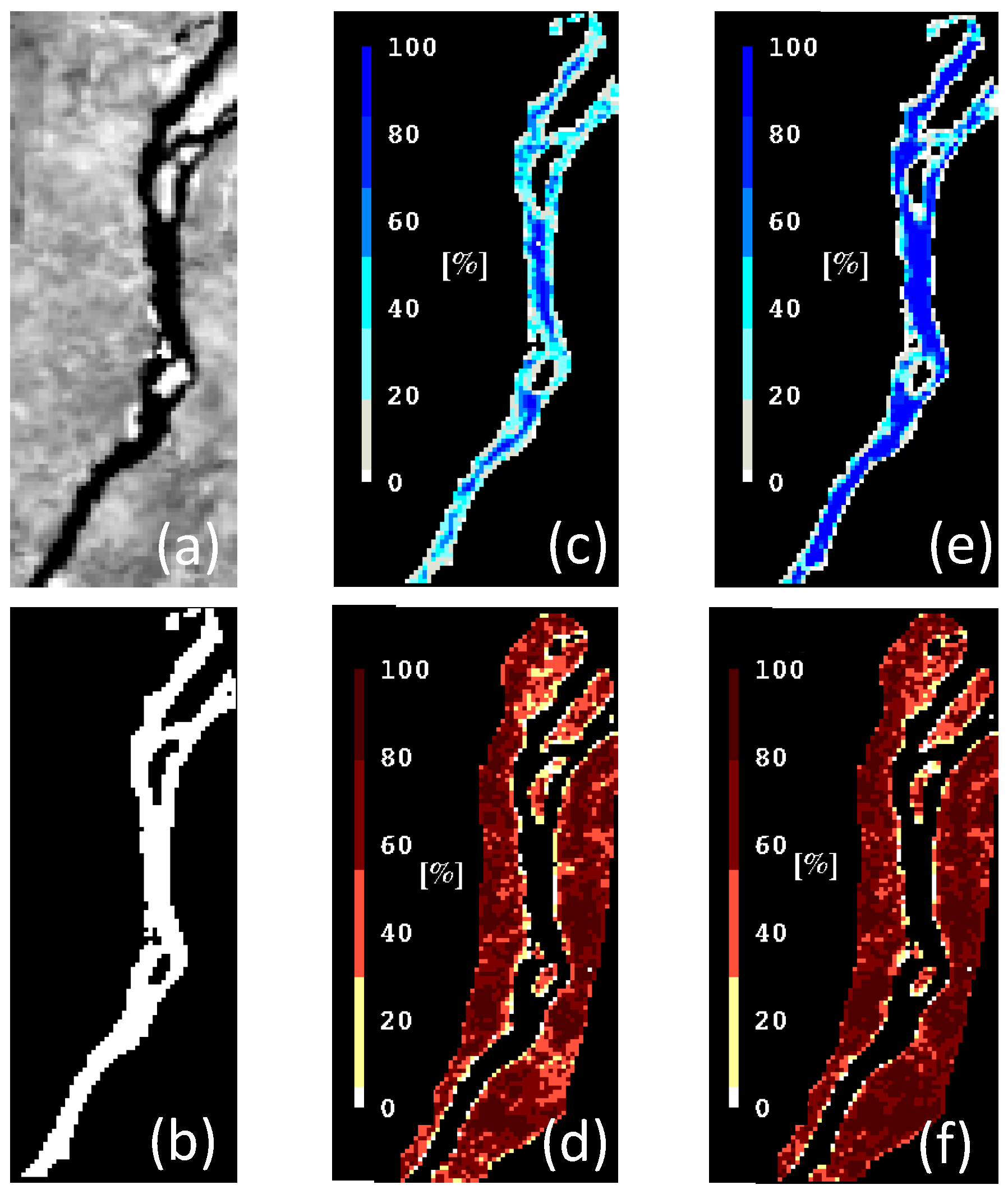For the uncertainty estimation, in both water and land masks, pixels with less than 10% marginal probability of their labels were considered as uncertain area. Although the method assigned a label for these pixels, we did not make a firm decision regarding their marginal probability. In the probabilistic water and land masks, most of the pixels with small marginal probabilities were located on shorelines. Considering the coarse MODIS pixel size, most of the pixels located in the river extent were partially covered by water. Therefore, the algorithm cannot assign correct labels for the pixels in this region with high probability. Therefore, we suggest taking advantage of satellite imagery with finer spatial resolution (such as Landsat images) specifically for the uncertain area. In our examples, the magnitude of the uncertain area varies between 8%–23% of the river area, which has a reverse relationship with the water area.