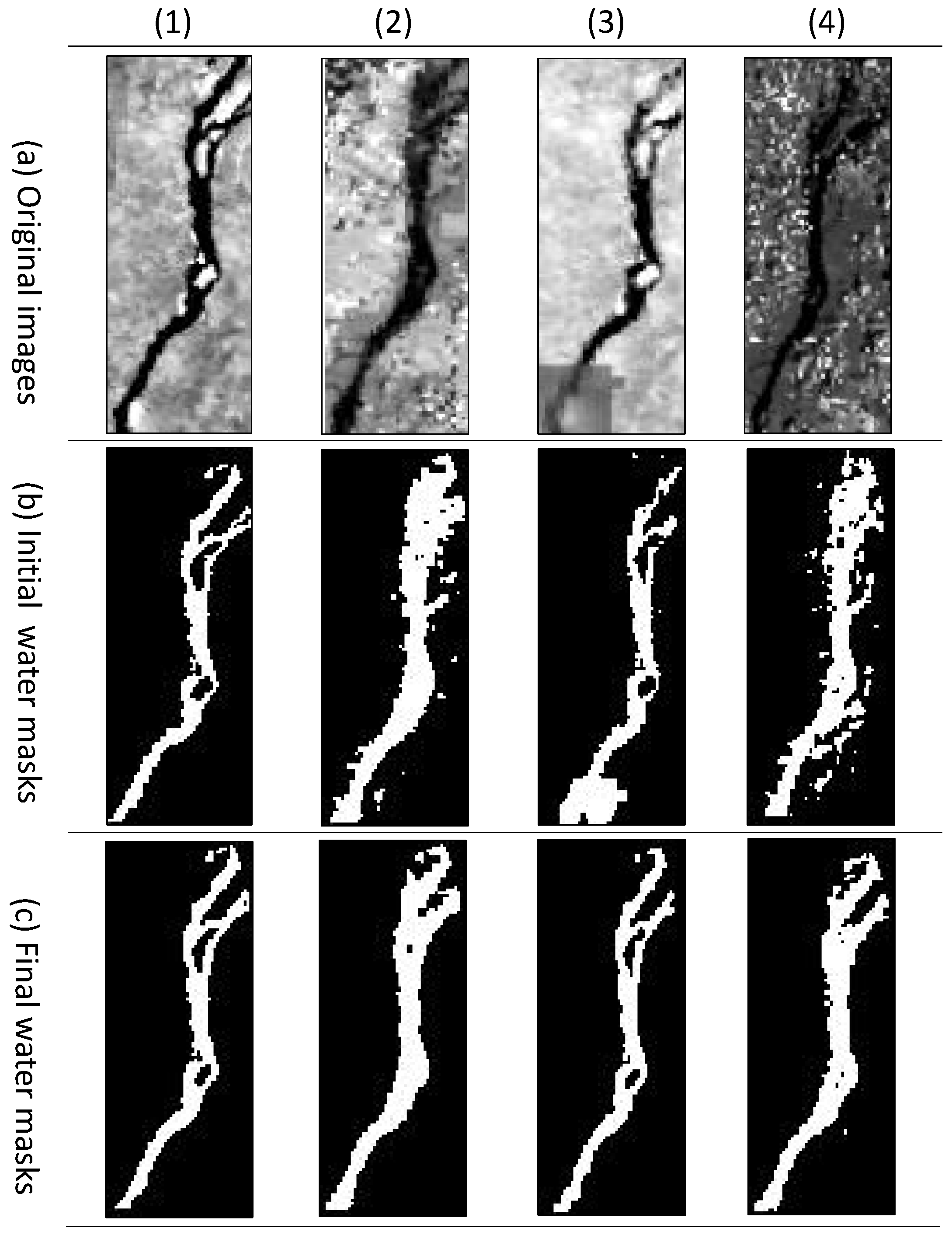 All of the studies mentioned in Table 1 applied pixel-based classification algorithms that use only the spectral information of pixels to make a decision about their label. In other words, they consider each pixel as a separate unit and ignore the spatial, temporal, and contextual relationship between pixels. Therefore, they are very susceptible to noise in the image and, in most cases, the primary results need some post-processing and cleaning steps. Moreover, when dealing with a multitude of images, post processing costs considerable time and effort. On a large scale, the performance of most of the mentioned algorithms is acceptable. However, for monitoring the water area of a small river reach, they cannot provide accurate measurements. It is also reported in [36] that when pixel-based methods are applied to high-resolution images, the accuracy of the final result may be reduced due to a so-called salt and pepper effect. Weih et al. in [36] compared the performance of pixel-based and region-based classification algorithms, and their results found that region-based algorithms are superior to the pixel-based methods. In Section 4.1 of this paper, we also demonstrate the poor performance of the pixel-based algorithms in one of our case studies. Interestingly, in our experience, pixel-based algorithms provide completely different river masks regarding their criteria to segment the image (Figure 23).