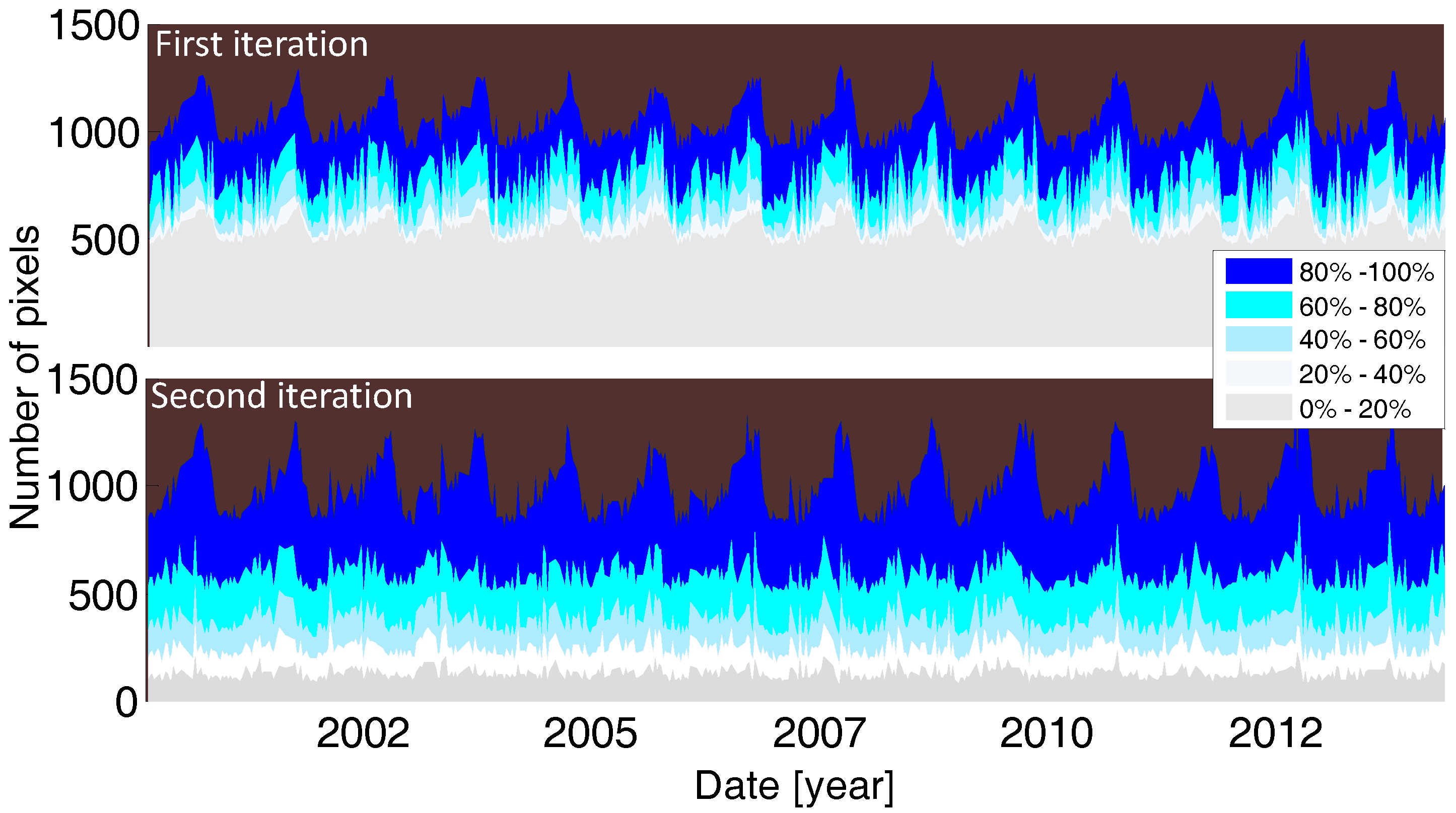 The time series of the water area together with their uncertainty are generated by applying the method to all images of the given river reaches. The input of our process is a time series of images. The algorithm automatically generates binary and probabilistic water masks together with water area time series, including the uncertainty range. Since cloud-covered images are detected and removed, and since we consider the temporal behavior of the water body, the products are robust against blunders. The algorithm can cope with the effect of sun glint and cloud shadow in the satellite images by considering temporal correlation in the images. Therefore, extra post-processing steps for the final time series are not necessary.
