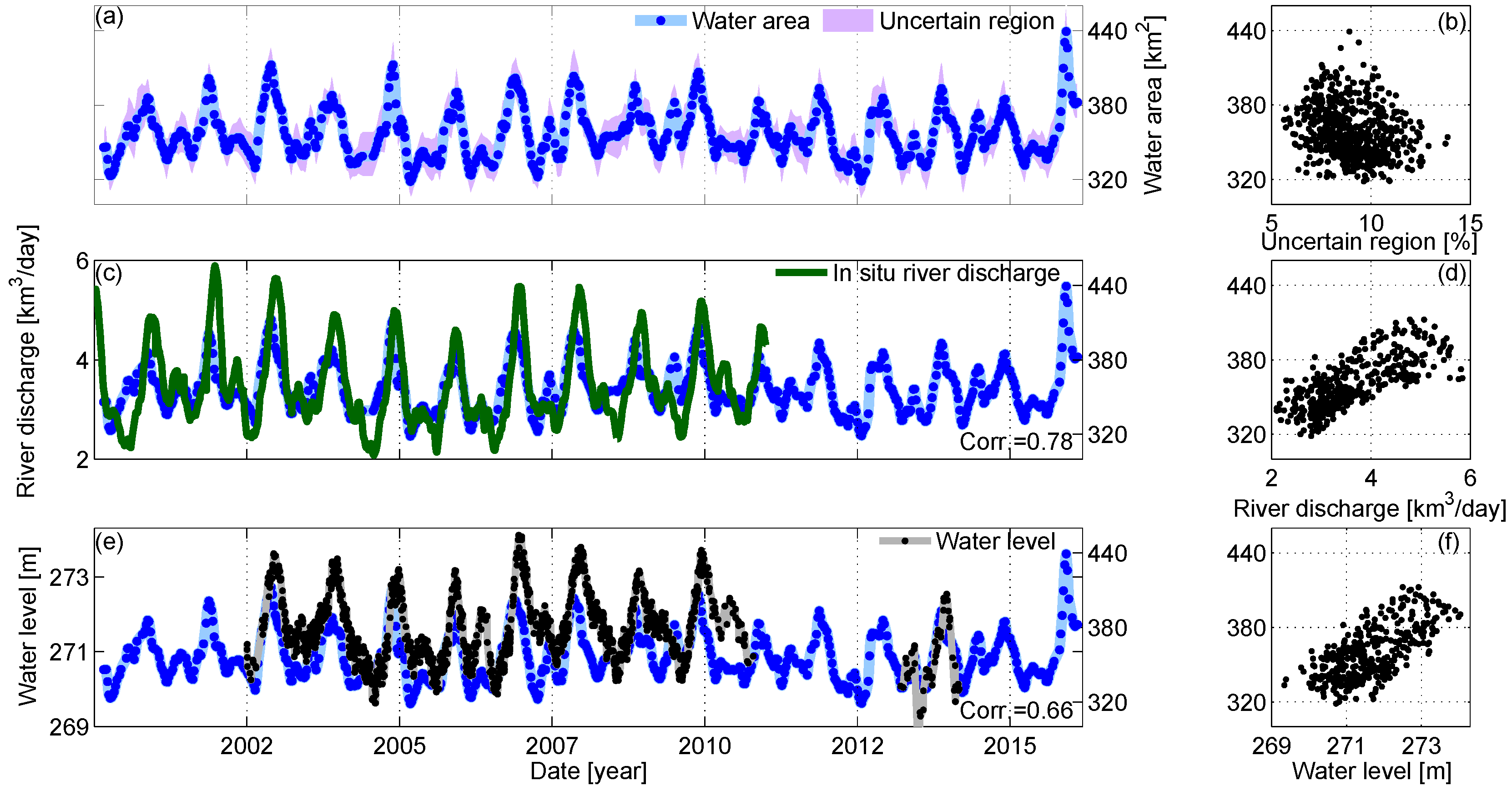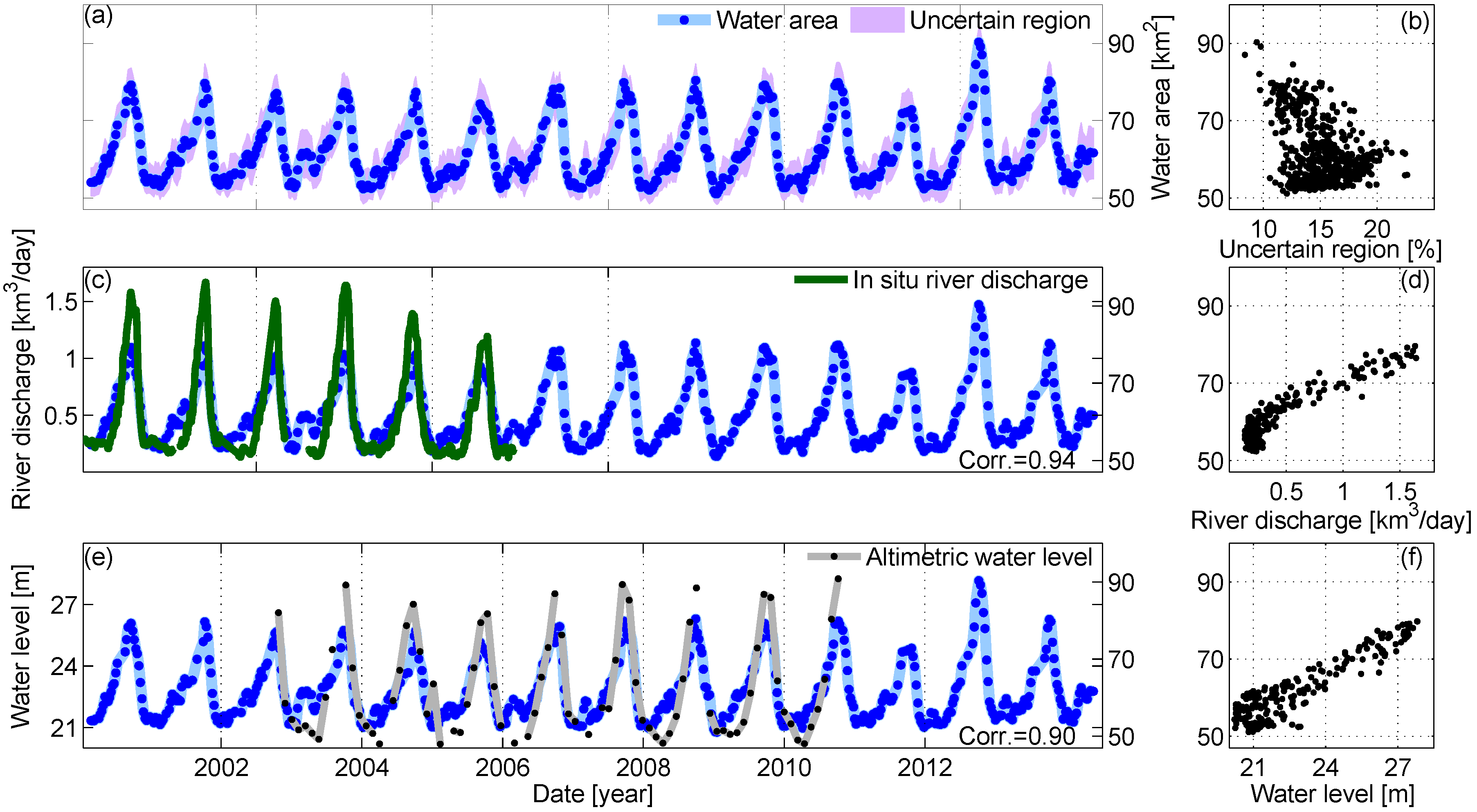 - Validate the measured water area time series indirectly through in situ river discharge and altimetric water level measurements.