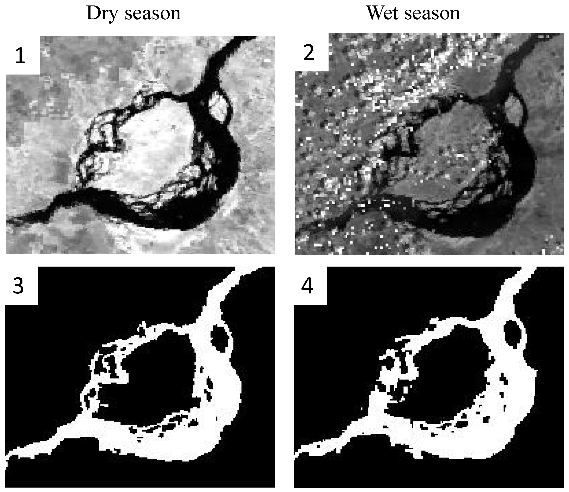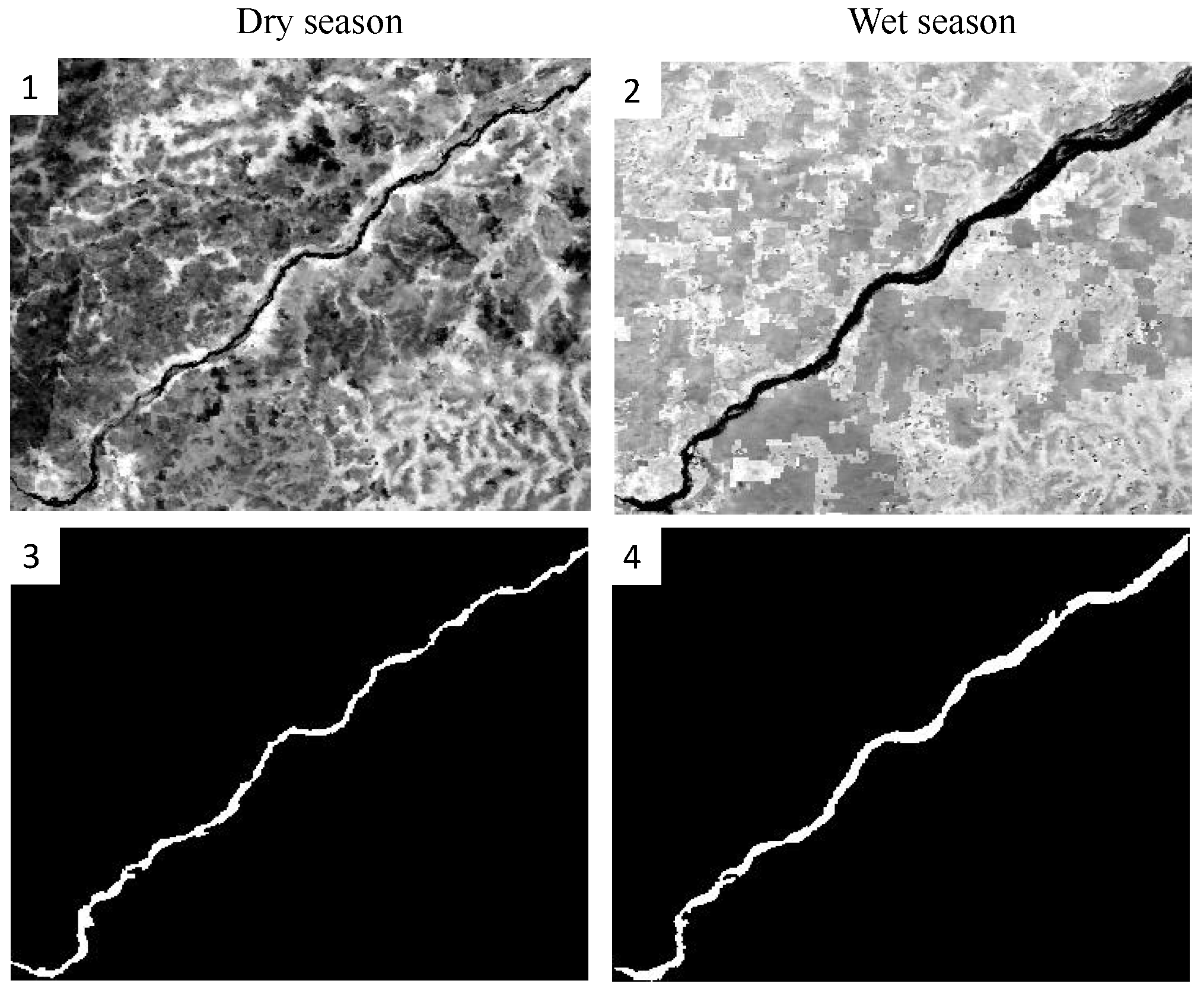 The first two river sections belong to the Niger River. The inland delta of the Niger River is one of the most fragile ecosystems of Sub-Saharan Africa. Patterns of land cover and land use vary extremely due to changes in the hydrological conditions of the Niger River and its tributaries. The Niger basin is comprised of very diverse ecoregions, ranging from the arid Sahel to the extremely wet coastal Niger Delta [37]. The amount of precipitation in the basin on dry and wet seasons varies significantly. Therefore, the river reach area changes with complex patterns due to the topography of the channels, the presence of vegetation, and the total amount of water filling the rivers [38].