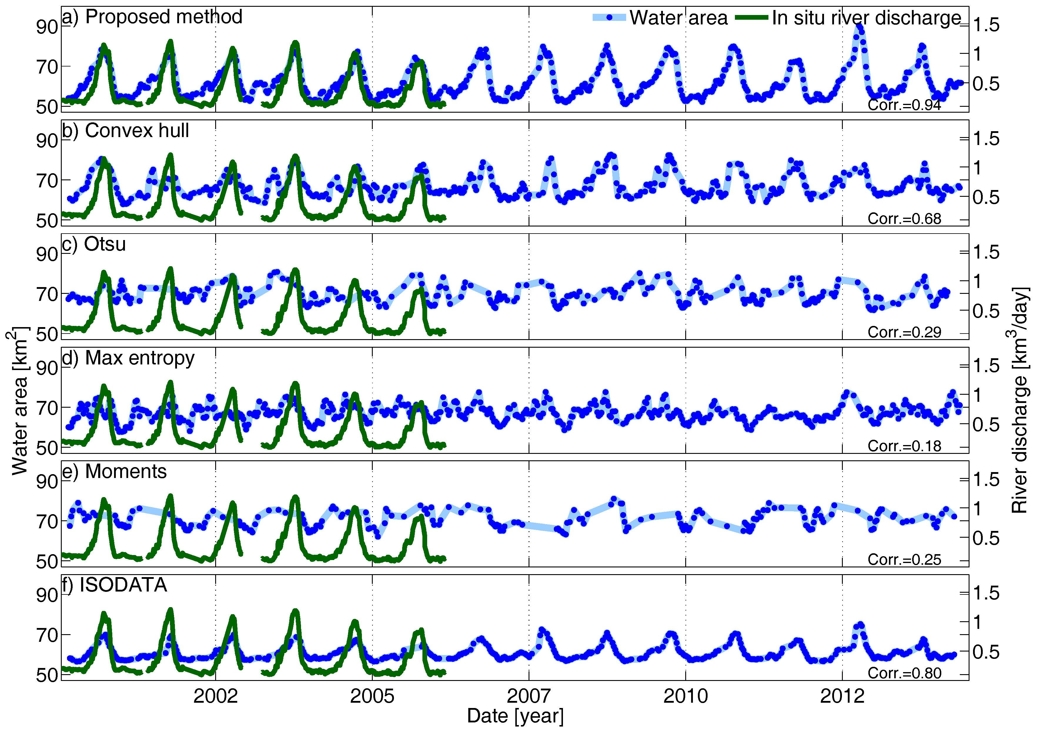 Figure 23 presents the water area time series generated by applying the aforementioned methods. To assess the performance of the results, we measure the correlation coefficient between water area and in situ river discharge time series. It should be noted that we additionally employed a number of post-classification steps, including a blunder removal step to provide the more accurate water masks. The correlation coefficients indicate that none of the above methods can generate a reliable water mask for hydrological purposes. Among them, ISODATA and convex hull can partially capture the seasonal behavior of the river. Moments and otsu methods cannot estimate the water mask for some images, as they are not able to find a proper threshold because of (1) a huge difference between the number of pixels in each class; (2) the complex relationship between water and land in the river border. By comparing the performance of the proposed method with the others, it is clear that none of the above methods can generate water area time series as accurately as our proposed method (corr. = 0.94). The main reason for the high correlation is that the strong spatial and temporal correlation between pixels is considered in our proposed method.