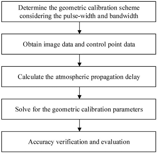 With the launch of high-resolution SAR satellites with multiple imaging modes by different countries, the cycle and cost of the geometric calibration tasks are becoming even more demanding, and there is a great focus on normalization and high-accuracy geometric calibration methods for spaceborne SAR. Therefore, in this paper, we propose a multimode hybrid geometric calibration method for spaceborne SAR that considers the atmospheric propagation delay. The error sources that affect the accuracy of geometric calibration are systematically analyzed. Based on correction of the atmospheric propagation delay, the geometric calibration model for spaceborne SAR is established. A high-precision geometric calibration scheme for spaceborne SAR is studied by considering the pulse-width and bandwidth (which is the range bandwidth) of the signal.