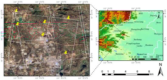 There are 33 scenes of YG-13 SAR images covering the Songshan calibration field area and 14 scenes of YG-13 SAR images covering the accuracy verification field area. The accuracy verification field areas include Taiyuan, Anping, Xianning, and Tianjin in China. The data were collected from 28 December 2015 to 29 May 2016, in strip-map mode and sliding spotlight mode. In order to analyze the experiments, the SAR images of the calibration field area and verification field area were acquired by left side-looking and right side-looking on the ascending orbit and descending orbit, respectively. Details of the acquired YG-13 SAR images are listed in Table 1, in which C1, C2, C3, C4, C5 and C6 represent the identifiers of pulse-width and bandwidth combinations.