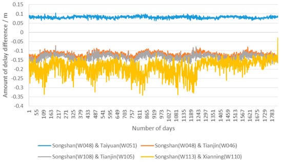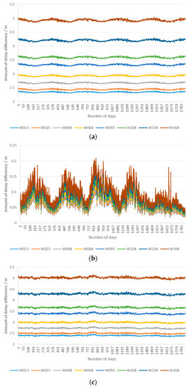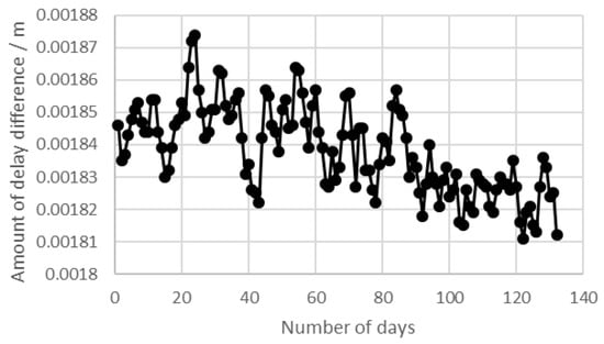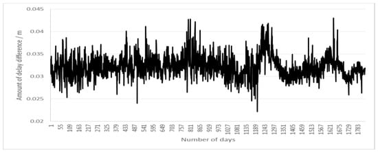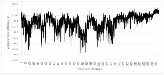 The atmospheric propagation delay of the radar signal is calculated using the following two methods. (1) Based on the ground point as the interpolation point, the zenith delay of the point is obtained, then the delay along the propagation path is calculated by a mapping function. (2) The interpolation points are acquired in the signal propagation direction at height intervals of 200 m up to 20 km. The atmospheric propagation delays of these points are calculated in the range of 200 m, and are cumulatively used to calculate the total delay value in the signal propagation direction. Finally, the delay differences between the two methods are compared. The results of the delay differences between 1 January 2016 and 11 May 2016 (up to 132 days) are shown in Figure 5.