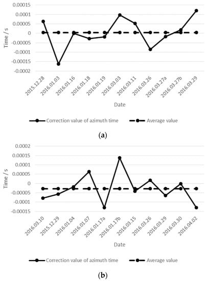 Variation trend of starting time correction value in azimuth. (a) 24.4 µs and 200 MHz; (b) 24.4 µs and 150 MHz.