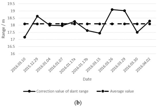 As can be seen from Figure 12, there are positive and negative values of starting time correction in azimuth, and the variation in starting time in azimuth is less than 0.2 ms. It is obvious that there is no systematic error in the azimuth starting time. Moreover, Figure 13 shows that the variation in starting range is less than 2 m, and the standard deviations of the slant range correction are 0.6094 m and 0.6088 m. It is clear that the variation trend of the geometric calibration parameters is stable.