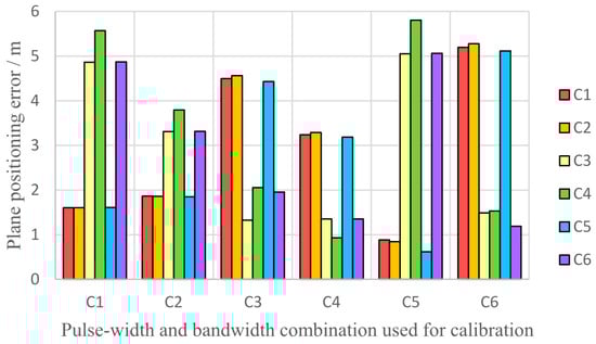 There are differences in the system time delays with different pulse-width and bandwidth combinations. In order to verify the necessity of the geometric calibration scheme proposed in this paper, a series of mutual calibration–compensation experiments is carried out using different pulse-width and bandwidth combinations. The experimental results are shown in Figure 14, where, the legend represents the pulse-width and bandwidth combinations for verification.
