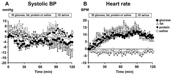 Changes from baseline in (A) Systolic blood pressure (BP) and (B) Heart rate in eight healthy older participants in response to intraduodenal (ID) infusion of glucose, fat, protein, and saline. Values are means ± SEM. * p < 0.05 for glucose compared with saline; † p < 0.05 for glucose compared with fat; ‡ p < 0.0001 for glucose compared with protein; ^ p < 0.05 for fat compared with saline; # p < 0.05 for protein compared with saline; + p < 0.05 for fat compared with protein []. BPM = beats per minute.