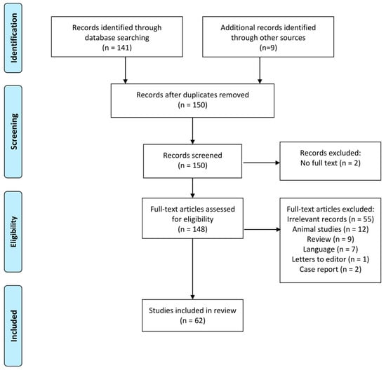 A total of 150 papers were identified from the database search. There were no duplicate papers. Of the 150 papers, papers without full text (n = 2), irrelevant papers (n = 55), animal studies (n = 12), reviews (n = 9), papers that were unavailable in the English language (n = 7), letters to the editor or comments (n = 1), and case reports (n = 2) were removed, leaving a total of 62 papers which were reviewed. Figure 2 summarizes the selection process.