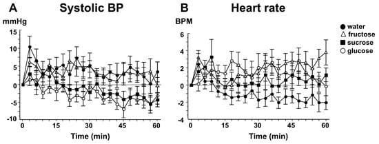 Change from baseline in (A) Systolic blood pressure (BP) and (B) Heart rate in 10 healthy older people following ingestion of four different study drinks (○, glucose; ■, sucrose; ∆, fructose; ●, water). Values are means ± SEM [].