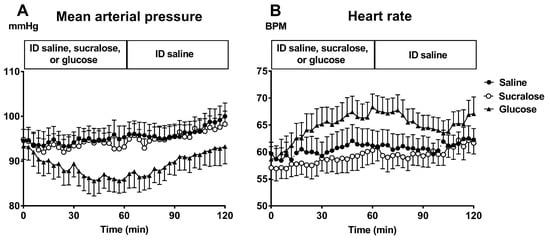 (A) Mean arterial pressure (MAP) and (B) Heart Rate in 12 healthy older subjects after intraduodenal (ID) infusion of glucose (▲), sucralose (ο), and saline (•). Values are means ± SEM. MAP: p < 0.05 for glucose compared with sucralose or saline, and p = 1.0 for sucralose compared with saline. Heart rate: p < 0.05 for glucose compared with sucralose, p = 0.07 for glucose compared with saline, and p = 1.0 for sucralose compared with saline [].