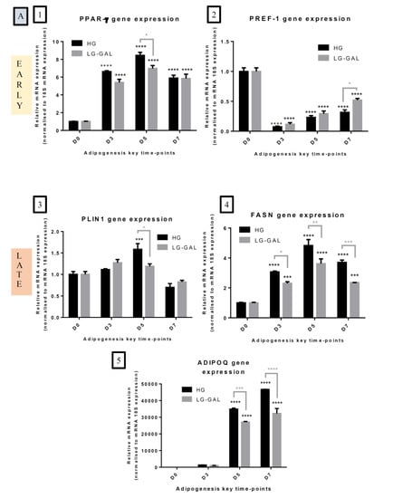 In order to confirm and validate the morphological changes and emergence of a lipid droplet network over time, key markers of both early and late adipogenesis phases were assessed in terms of gene and protein expressions. Differentiation induction is related to a significant increase at the transcriptional level of the adipogenesis master regulator, peroxisome proliferator-activated receptor γ (PPARγ), during the early adipogenesis phase yet significantly lower in the LG-GAL condition (Figure 2(A1)). In parallel, the expression of PREF-1, an autocrine and paracrine factor preventing the advancement to mature adipocytes [,,], has been evaluated at the transcriptional level in both conditions. The results show a significant decrease of this adipogenesis repressor in both conditions, although to a lesser extent in the LG-GAL condition (Figure 2(A2)). At a later phase of the differentiation process, perilipin 1 (PLIN1), a gene encoding a protein surrounding a lipid droplet and playing a critical role in adipocyte lipid metabolism [,,,,], was also assessed. By D5, a peak of PLIN1 expression was reached in the HG condition in maturating 3T3-L1 (Figure 2(A3,B,C)). After considering lipid droplets shaping and dynamic aspects, the lipogenesis enzymatic angle has been investigated through the evaluation of FASN gene expression, which is a gene encoding an enzyme catalyzing a critical step of fatty acid synthesis (Figure 2(A4)). A progressive increase of FASN expression with adipogenesis induction was noticed, yet with a lower expression level in the LG-GAL condition in differentiating 3T3-L1. In parallel, adiponectin, a major adipokine secreted by mature adipocytes, was also explored through possible changes in gene and protein expression in both conditions (Figure 2(A5,B,C2)). As for other mature adipocyte markers, adiponectin expression is significantly stimulated during more advanced adipogenesis phases in both conditions, although to a lower extent in the LG-GAL condition.