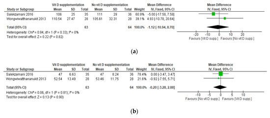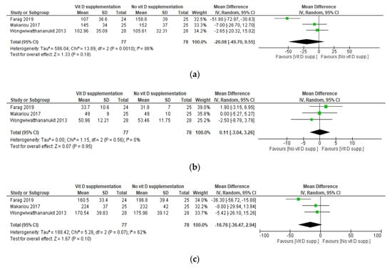 Based on the administered daily dose equivalent of vitamin D, two sets of meta-analyses were conducted. The first one included the studies by Makariou et al. [30], Farag et al. [35], and the I2 arm of the study by Wongwiwatthananukit et al. [33]. The analysis consisted of comparing a low dose of VDS versus no supplementation, namely placebo or dietary intervention. The other analysis included the study by Salekzamani et al. [36] and the I1 arm of the study by Wongwiwatthananukit et al. [33] and consisted of comparing a high dose of VDS versus placebo.