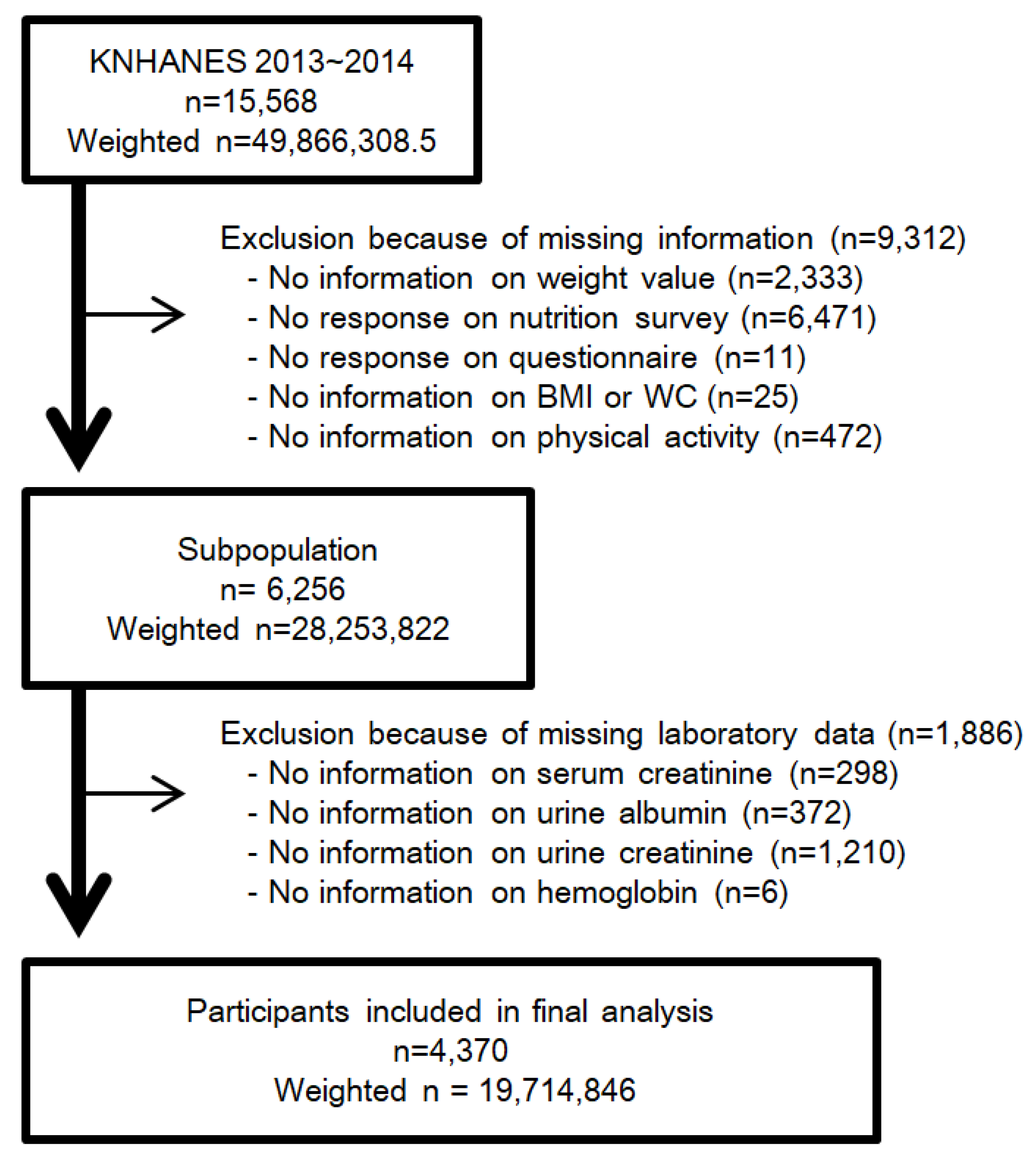 Flow diagram for determining study population with the exclusion and inclusion criteria. Abbreviation: KNHANES, Korean National Health and Nutrition Experimental Survey; n, unweighted number of participants; weighted n, weighted number of participants using complex samples design; BMI, body mass index; WC, waist circumference.