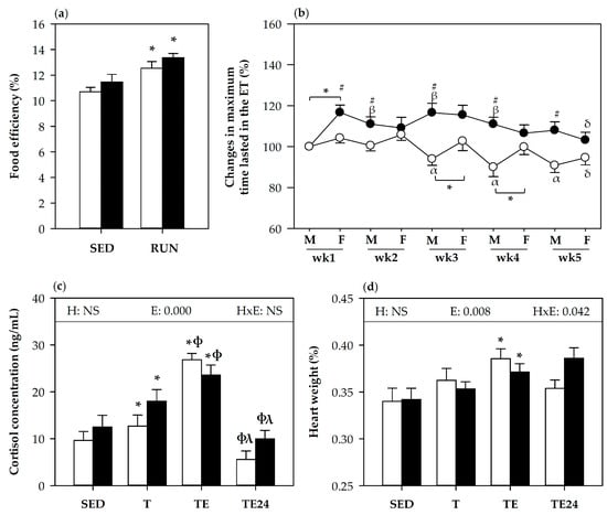 Food efficiency during the study (a), changes in maximum time supported in the exhaustion tests performed throughout the study (percentage with respect to the first exhaustion test) (b), cortisol concentration (c), and relative heart weight (d) at the end of the study. ET = exhaustion test; F = Friday; M = Monday; RUN = runner animals; SED = sedentary animals; T = trained groups; TE = T groups with an additional exhaustion test; TE24 = TE groups 24 h after the exhaustion test; wk = week. NS = no statistically significant differences detected. The non-supplemented group is represented by white symbols (○) and bars, and the hesperidin-supplemented group by black symbols (●) and bars. Data are expressed as mean ± standard error of the mean (SEM, n = 3-8 for a, n = 24 for b, n = 8 for c and d). Statistical difference in (a,c,d), the inset table shows two-way analysis of variance (ANOVA) results when applied (H, hesperidin; E, exercise, H–E, interaction between hesperidin and exercise): * p < 0.05 vs. SED group; ϕ p < 0.05 vs. T group; λ p < 0.05 vs. TE group. Statistical difference in (b): * significant differences between consecutive ETs for both non-supplemented and the hesperidin-supplemented groups (p < 0.05); α significant differences in the non-supplemented group vs. the first and the second Monday ET (p < 0.05); β significant differences in the hesperidin-supplemented group vs. the first Monday ET (p < 0.05) and δ significant differences in both non-supplemented and hesperidin-supplemented groups vs. the first Friday ET (repeated-measures ANOVA followed by paired Student’s t test); # significant differences between non-supplemented and the counterpart hesperidin-supplemented group (p < 0.005, Student’s t-test).