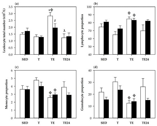 Blood leukocytes counts (a), and percentages of lymphocytes (b), monocytes (c) and granulocytes (d). The non-supplemented groups are represented by white bars and the hesperidin-supplemented groups by black bars. SED = sedentary groups; T = trained groups; TE = T groups with an additional exhaustion test; TE24 = TE groups 24 h after the exhaustion test. Data are expressed as mean ± SEM (n = 8). Statistical difference (Mann–Whitney U test): * p < 0.05 vs. SED group; ϕ p < 0.05 vs. T group; λ p < 0.05 vs. TE group; # significant differences between non-supplemented and the counterpart hesperidin-supplemented group (p < 0.05).