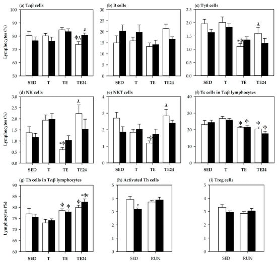 Percentages of blood lymphocytes: T (TCRαβ+) (a), B (TCRαβ- TCRγδ-CD161b-) (b), Tγδ (TCRγδ+) (c), natural killer (NK) (CD161b+) (d), natural killer T (NKT) (CD161b+TCRαβ+) (e), Th (CD4+CD161b- in TCRαβ+) (f), Tc (CD8+CD161b- in TCRαβ+) (g), Tact (CD25+Foxp3- in CD4+ TCRαβ+) (h), and Treg (CD25+Foxp3+ in CD4+ TCRαβ+) (i) cells. The proportions of Treg and Tact cells were established one week before final exhausting test (therefore, all runners). The non-supplemented groups are represented by white bars and the hesperidin-supplemented groups by black bars. SED = sedentary groups; T = trained groups; TE = T groups with an additional exhaustion test; TE24 = TE groups 24 h after the exhaustion test. Data are expressed as mean ± SEM (n = 8 for a–g, n = 8–15 for h,i). Statistical difference (Mann–Whitney U test): * p < 0.05 vs. SED group; ϕ p < 0.05 vs. T group; λ p < 0.05 vs. TE group; # significant differences between non-supplemented and the counterpart hesperidin-supplemented group (p < 0.05).