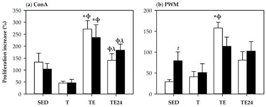 Proliferation capacity of spleen T lymphocytes (a) and B lymphocytes (b). The non-supplemented groups are represented by white bars and the hesperidin-supplemented groups by black bars. SED = sedentary groups; T = trained groups; TE = T groups with an additional exhaustion test; TE24 = TE groups 24 h after the exhaustion test. Data are expressed as mean ± SEM (n = 8). Statistical differences (Mann–Whitney U test for a, and two-way ANOVA followed by Tuckey for b): * p < 0.05 vs. SED group; ϕ p < 0.05 vs. T group; λ p < 0.05 vs. TE group; # significant differences between non-supplemented and the counterpart hesperidin-supplemented group (p < 0.05).